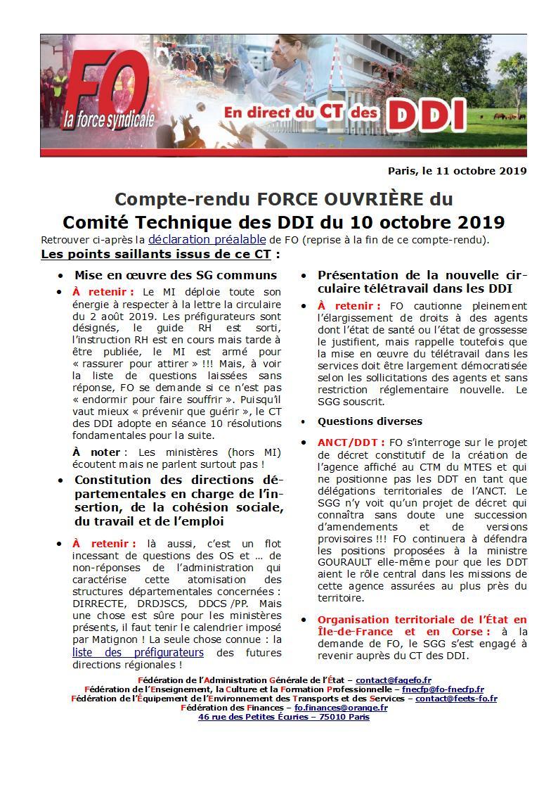 Retrouvez ICI le compte-rendu du CT des DDI du 10 octobre 2019, ainsi que les éléments portés en ouverture par FO ICI.