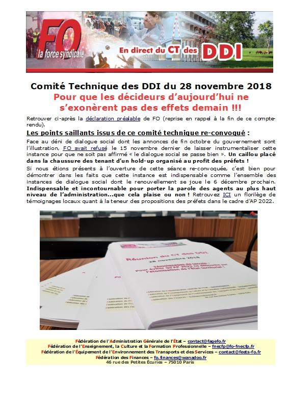 CT des DDI du 28 novembre 2018: le compte-rendu FO CR Réunion 29 novembre 2018 Malvina Caubère Retrouvrez ICI le compte-rendu de la réunion du CT des DDI du 28 novembre 2018. Cliquez ICI