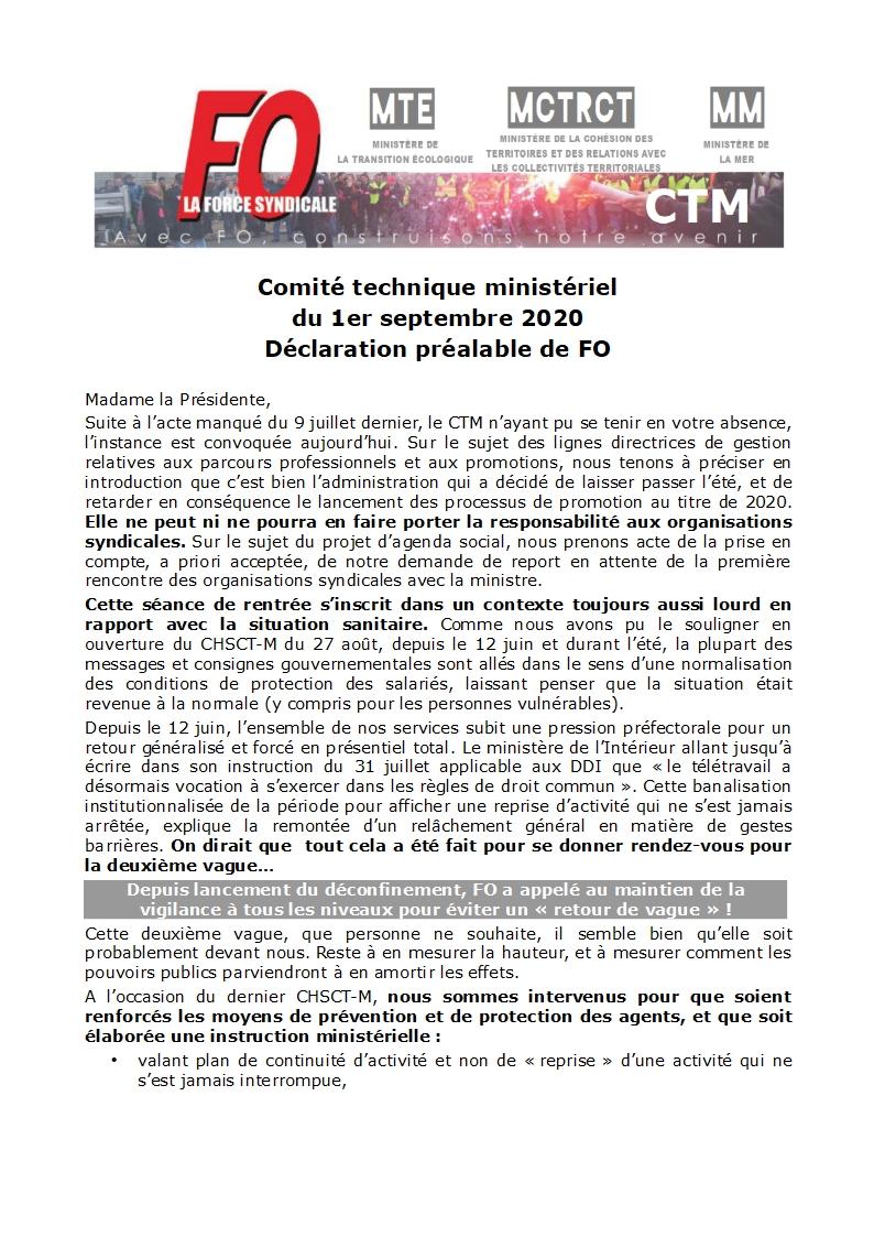 CTM du 1er septembre 2020: les éléments portés par FO en ouverture Communiqué 1 septembre 2020 Malvina Caubère Retrouvez ICI la déclaration préalable portée par FO en ouverture du Comité Technique Ministériel du 1er septembre 2020. Cliquez ICI