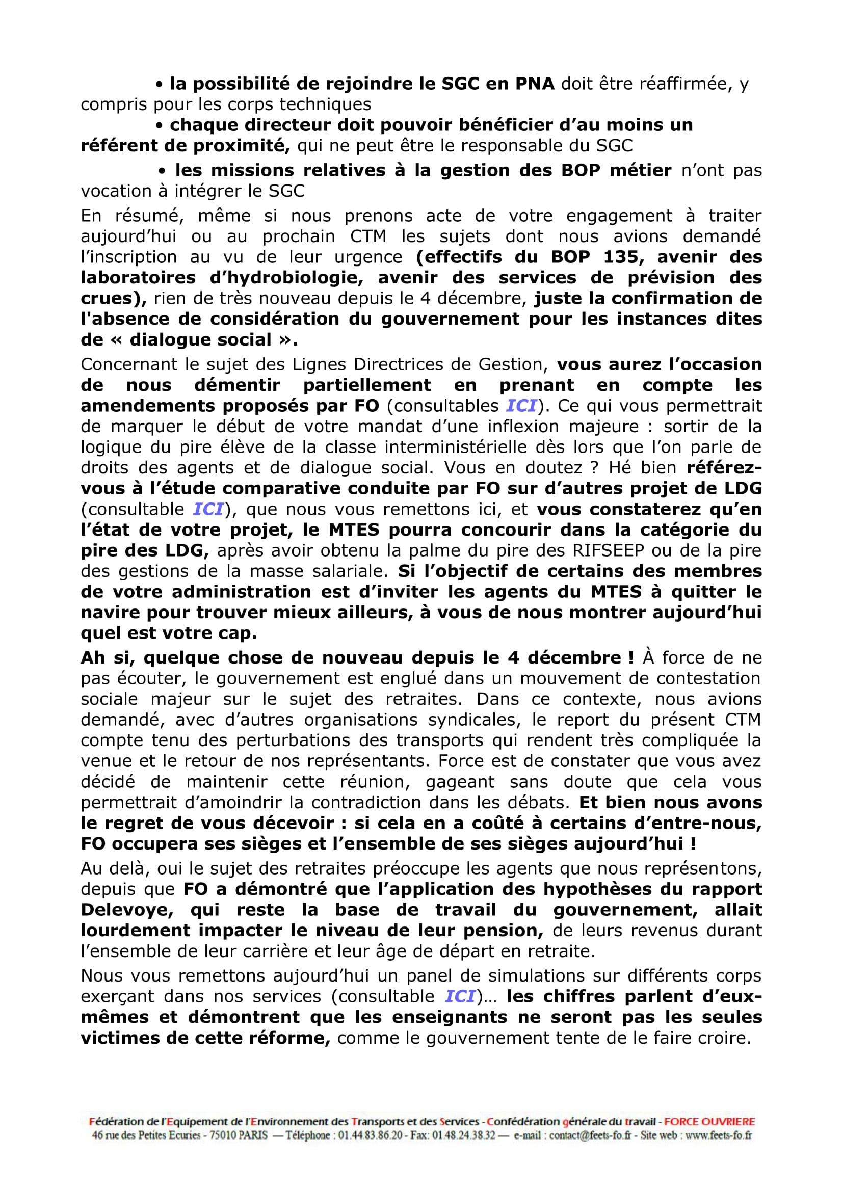 Retrouvez ICI la déclaration préalable de FO en ouverture du CTM reconvoqué du 8 janvier, ainsi que le document remis à cette occasion Lignes Directrices de Gestion « mobilité » : Le « Moins mauvais chez les autres » confronté au «Pire du MTES »