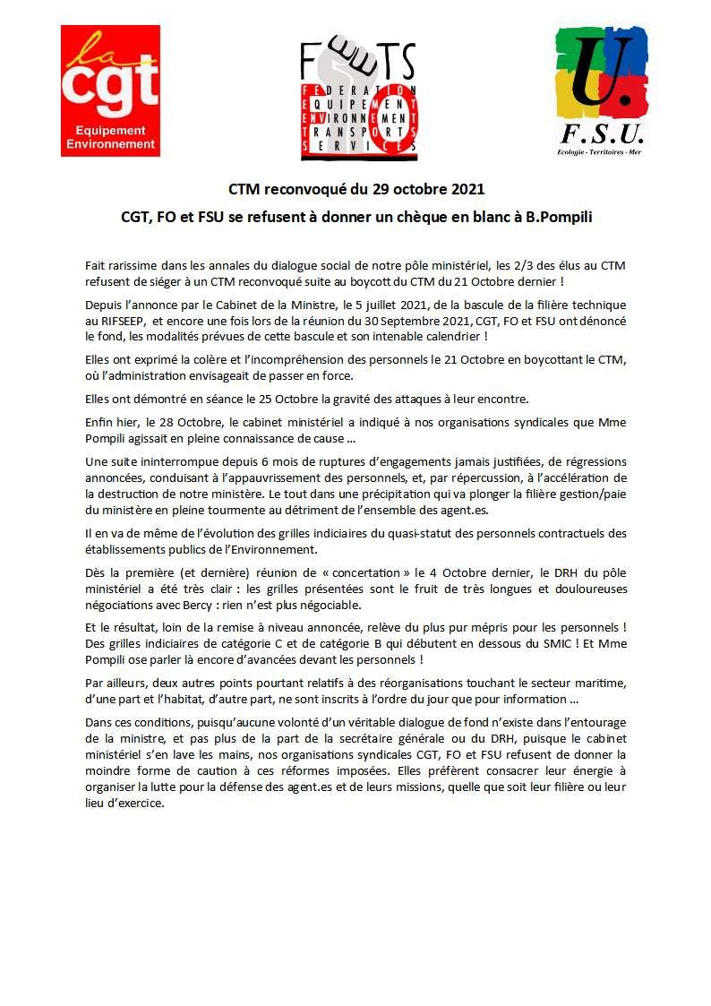 CTM reconvoqué du 29 octobre 2021 CGT, FO et FSU se refusent à donner un chèque en blanc à B.Pompili