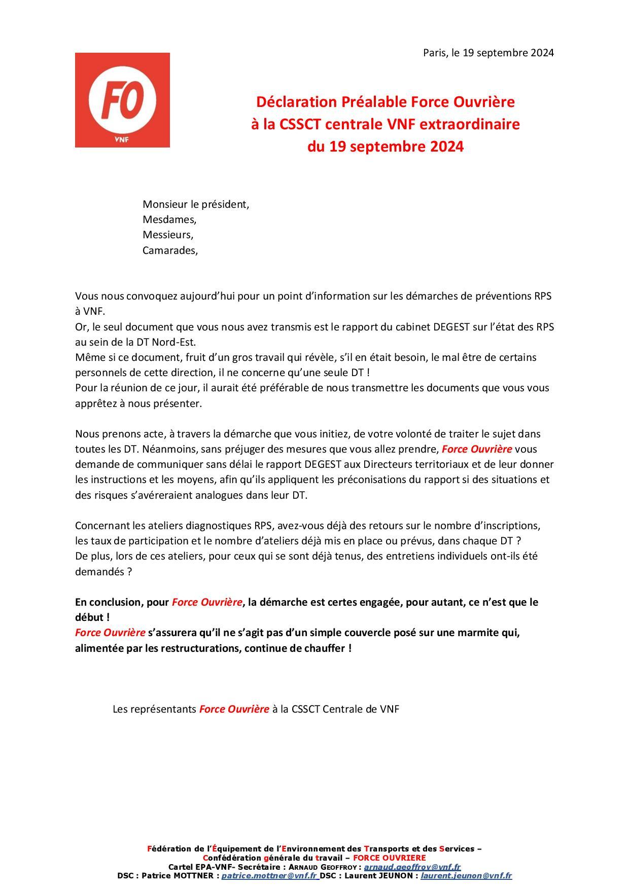Déclaration Préalable Force Ouvrière à la CSSCT centrale VNF extraordinaire du 19 septembre 2024 CR Réunion 20 septembre 2024 Malvina Caubère