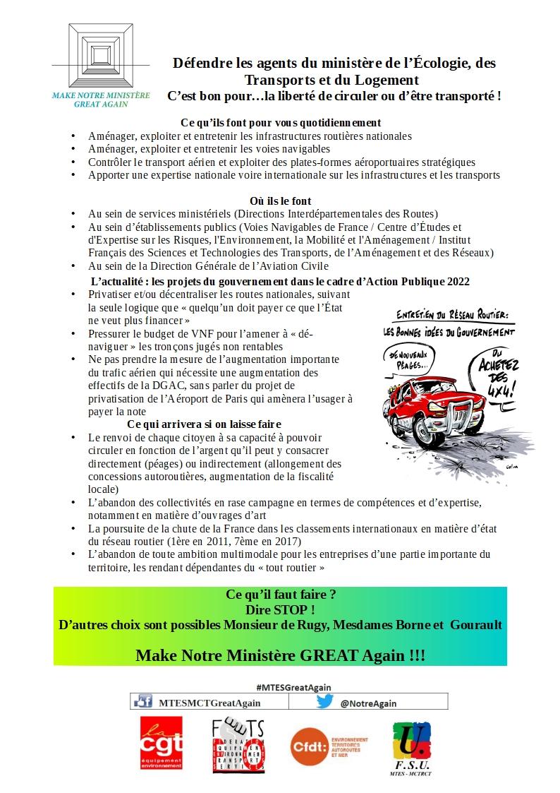 Ce que les agents du MTES font quotidiennement pour la nation en matière de liberté de circuler ou d’être transporté, où ils le font, les projets du gouvernement dans le cadre d’Action Publique 2022, ce qui arrivera si on laisse faire?