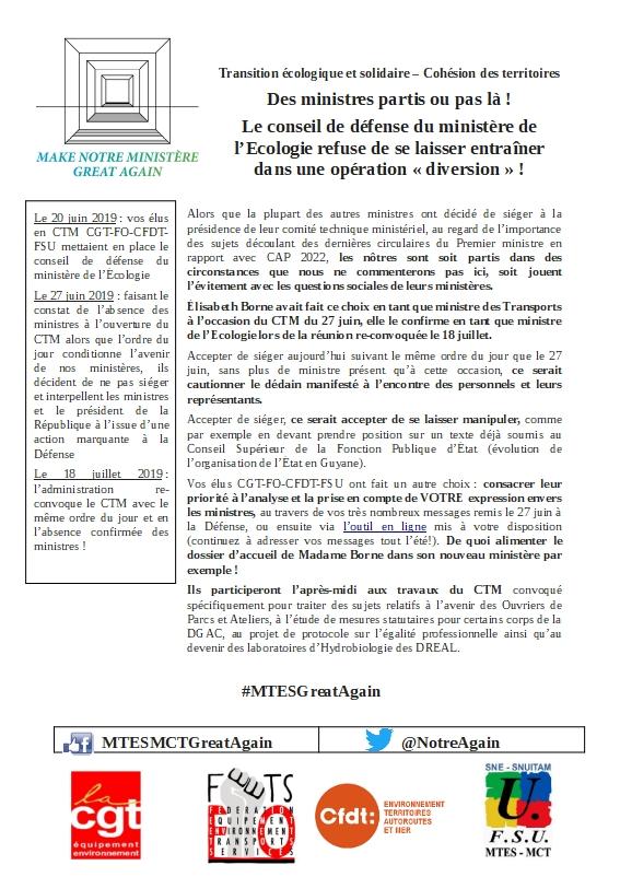 Vos élus CGT-FO-CFDT-FSU ont fait un autre choix : consacrer leur priorité à l’analyse et la prise en compte de VOTRE expression envers les ministres, au travers de vos très nombreux messages remis le 27 juin à la Défense, ou ensuite via l’outil en ligne mis à votre disposition (continuez à adresser vos messages tout l’été!). De quoi alimenter le dossier d’accueil de Madame Borne dans son nouveau ministère par exemple !