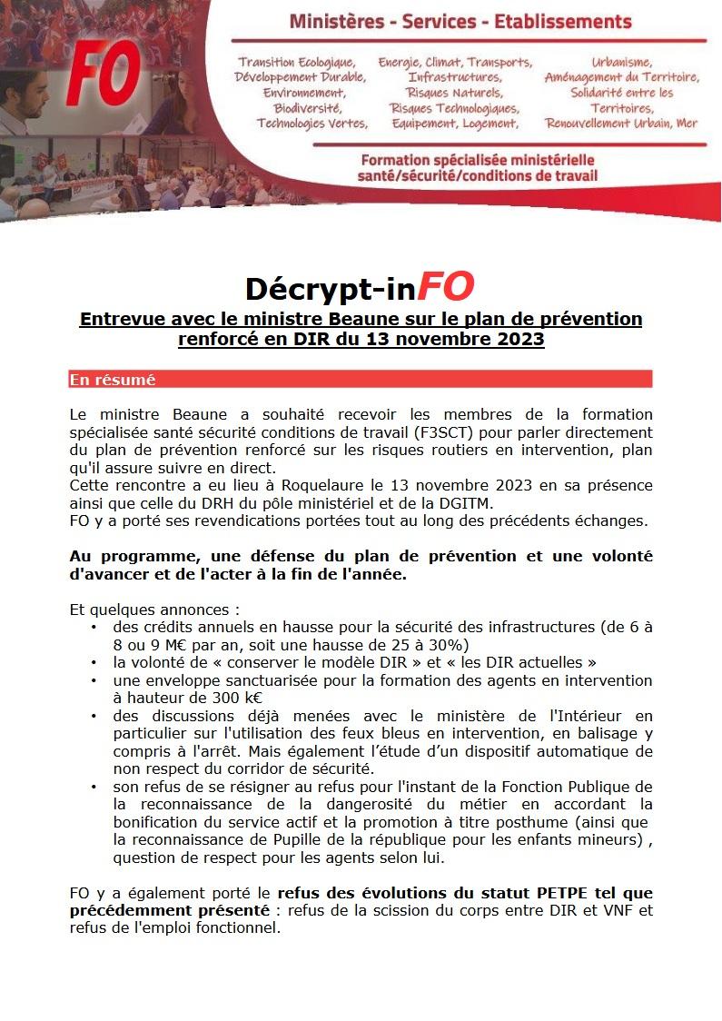 FO y a porté ses revendications portées tout au long des précédents échanges. Au programme, une défense du plan de prévention et une volonté d’avancer et de l’acter à la fin de l’année, et quelques annonces (des crédits annuels en hausse pour la sécurité des infrastructures +25 à 30%, la volonté de « conserver le modèle DIR » et « les DIR actuelles », une enveloppe sanctuarisée pour la formation des agents en intervention à hauteur de 300 k€, des discussions déjà menées avec le ministère de l’Intérieur en particulier sur l’utilisation des feux bleus en intervention, en balisage y compris à l’arrêt et également l’étude d’un dispositif automatique de non respect du corridor de sécurité, son refus de se résigner au refus pour l’instant de la Fonction Publique de la reconnaissance de la dangerosité du métier en accordant la bonification du service actif et la promotion à titre posthume).