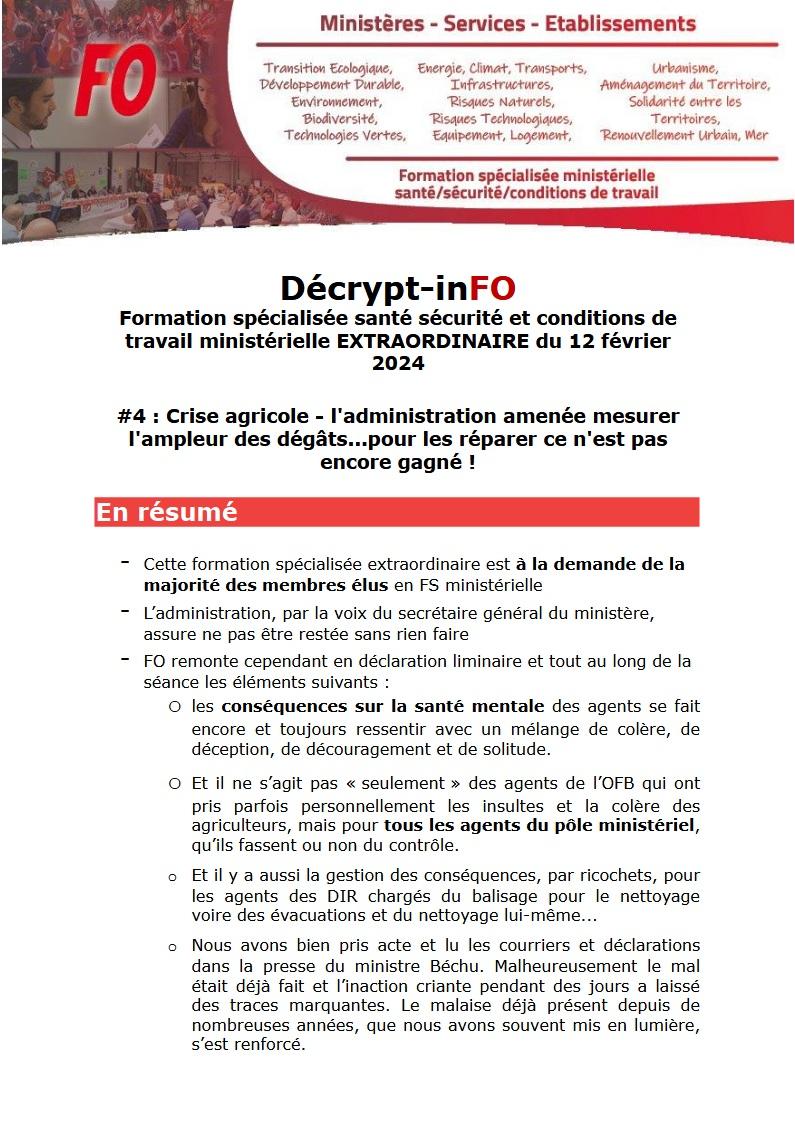 La demande quasi-unanime de réunir la formation SSCT ministérielle du MTECT en format extraordinaire, réunion organisée en réponse le 12 février, a amené l’administration à mesurer formellement l’ampleur des dégâts…pour les réparer ce n’est pas encore gagné! A noter que FO a formulé la même demande auprès du ministère de l’Intérieur pour évoquer la situation des DDI.