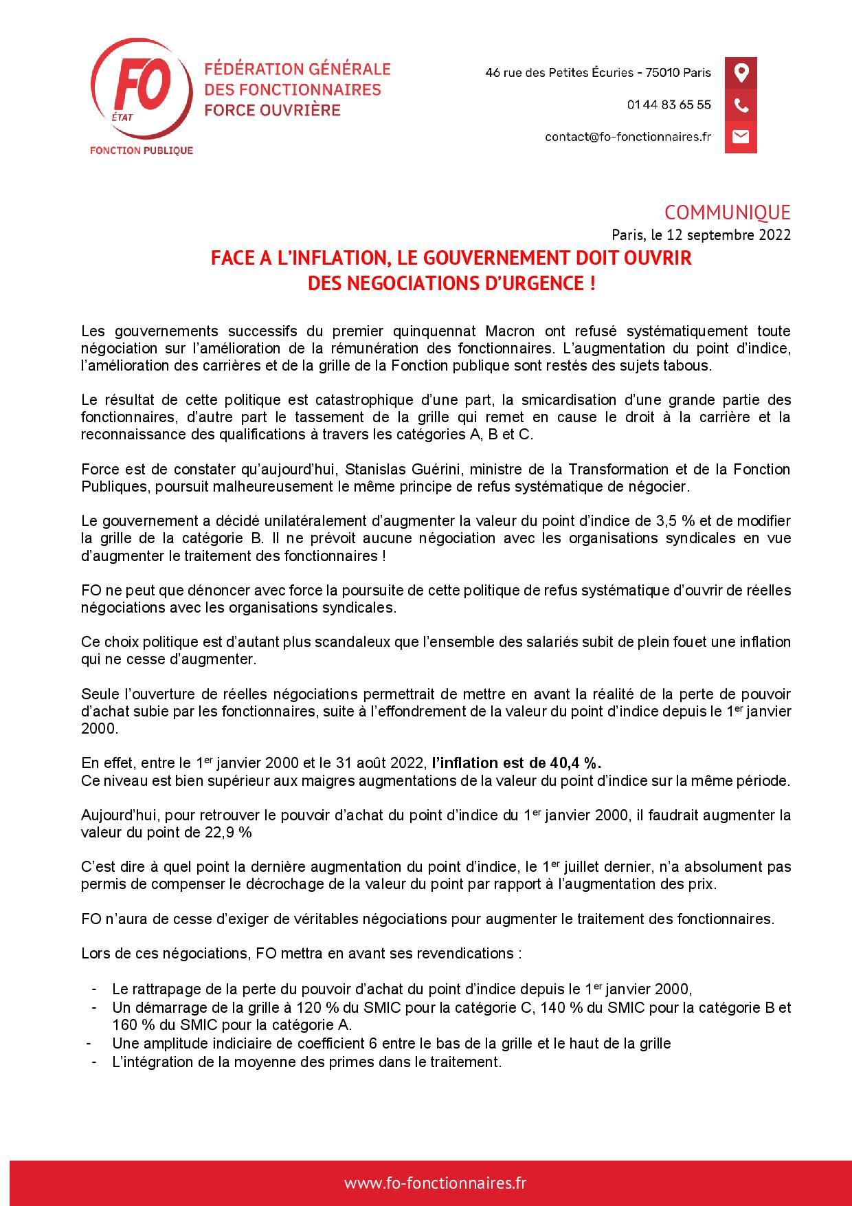 Face à l’inflation, le gouvernement doit ouvrir des négociations d’urgence Communiqué 12 septembre 2022 Malvina Caubère