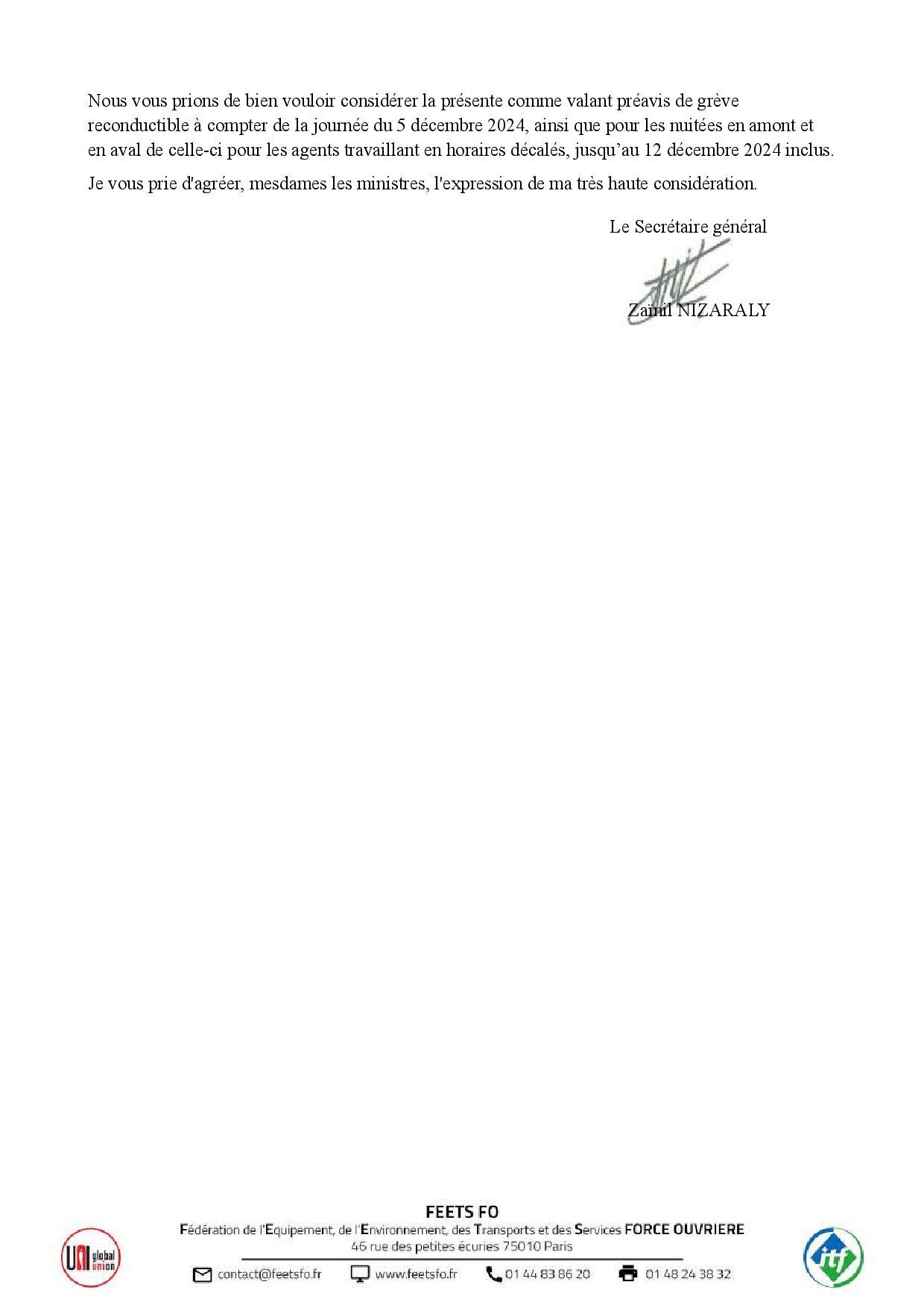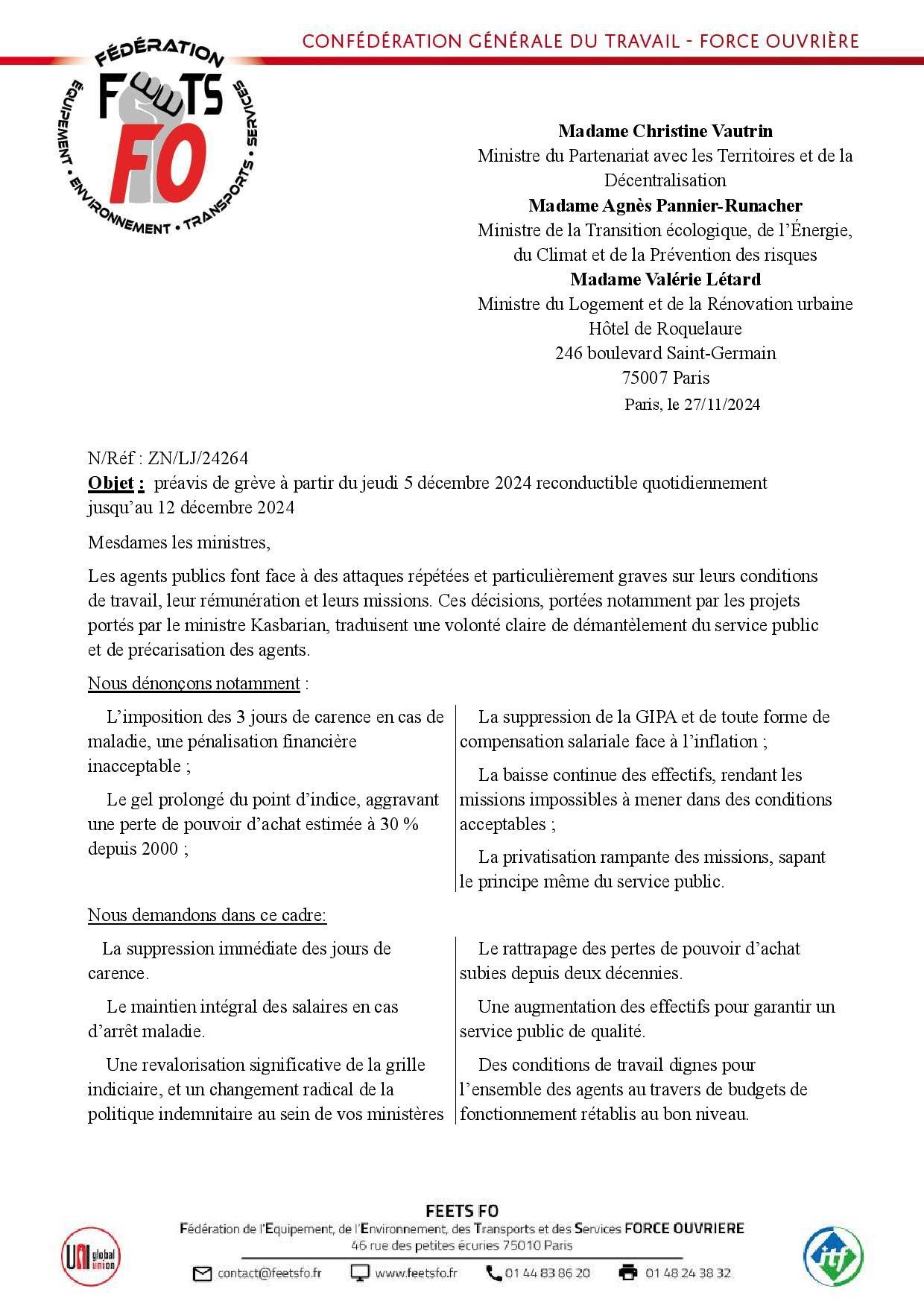 Retrouvez ICI le préavis de grève déposé auprès des ministres du MTEL couvrant la période du 5 au 12 décembre 2024, en réponse aux projets du gouvernement contre la Fonction Publique.