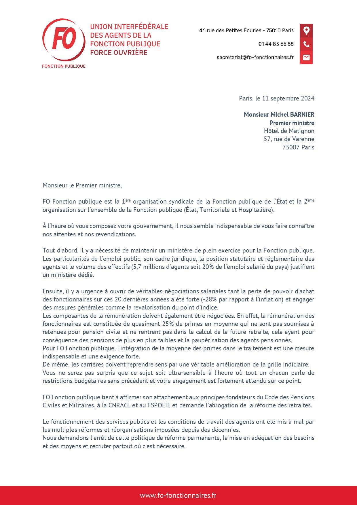 FO dresse au nouveau Premier ministre la liste des sujets à traiter pour la Fonction Publique Communiqué 11 septembre 2024 Malvina Caubère