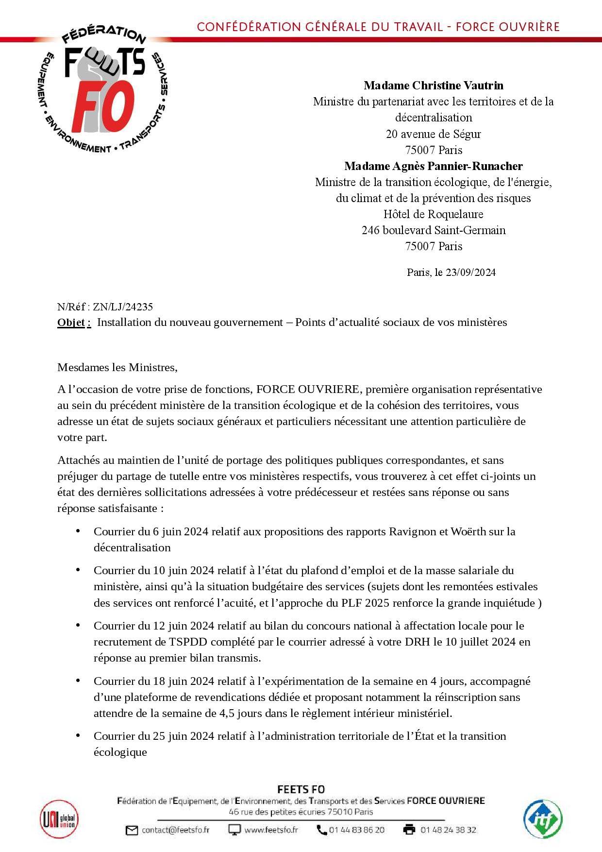 A l’occasion de leur prise de fonctions, FORCE OUVRIERE, première organisation représentative au sein du précédent ministère de la transition écologique et de la cohésion des territoires, a adressé ICI un état de sujets sociaux généraux et particuliers nécessitant une attention particulière de la part des nouvelles ministres en charge du partenariat avec les territoires et de la décentralisation, et de la transition écologique, de l’énergie, du climat et de la prévention des risques.