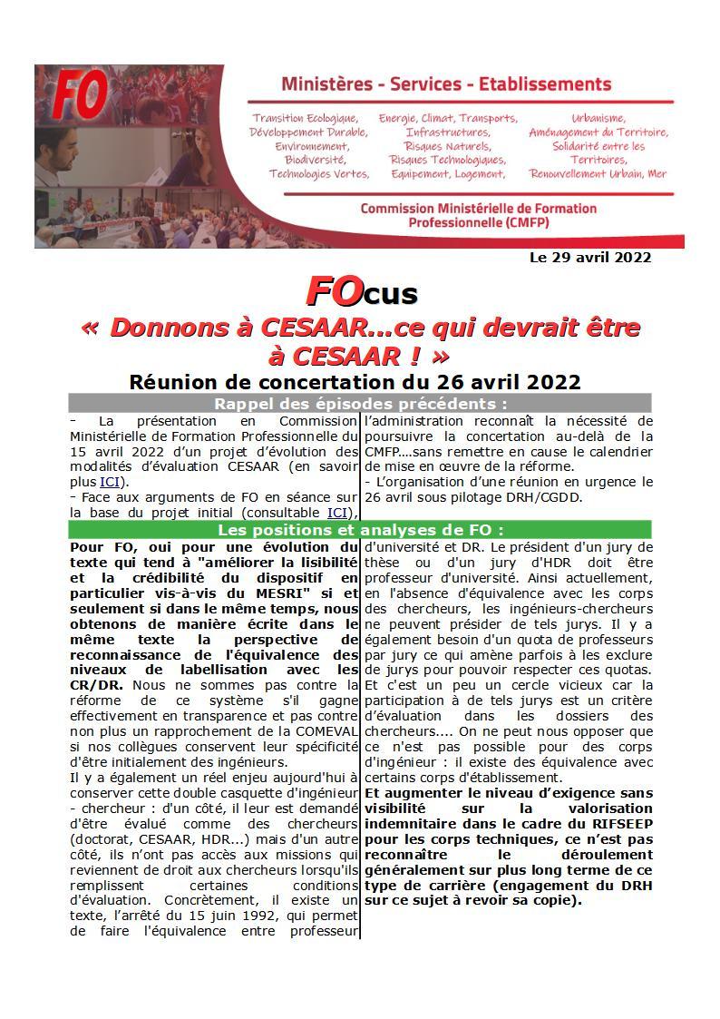 Retrouvez ci-dessous notre FOcus « Donnons à CESAAR…ce qui devrait être à CESAAR ! » issu de la réunion dse concertation du 26 avril 2022 avec le CGDD et la DRH du MTE.