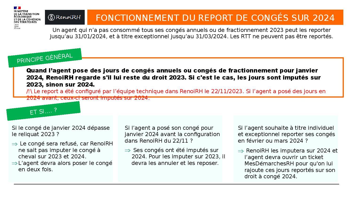 Suite à notre intervention lors du Comité Social d’Administration du 17 octobre dernier (en marge du point relatif à la préparation des JO), et conformément aux engagements pris en séance, la DRH a adressé une instruction aux services du MTECT et ses EP pour notamment autoriser le report de congés 2023 jusqu’au 31 janvier 2024 « de base », et jusqu’au 31 mars 2024 « à titre individuel et exceptionnel ». Une mention conforme à celle dont nous avons obtenu la pérénisation dans les instructions du ministère de l’Intérieur en DDI.