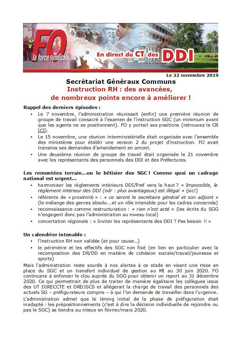 . Le 7 novembre, l’administration réunissait (enfin) une première réunion de groupe de travail consacré à l’examen de l’instruction SGC (un minimum avant que les agents ne se positionnent). FO y portait ses positions.