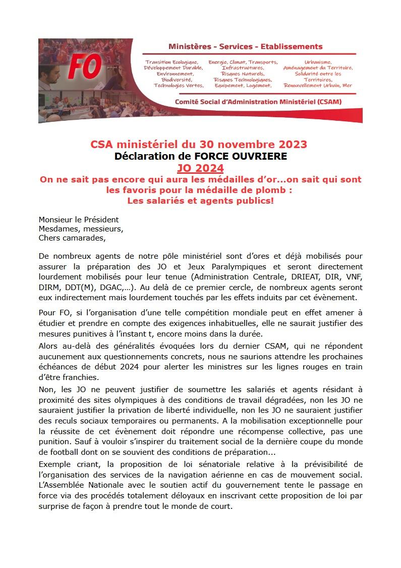 Retrouvez ci-dessous la déclaration préalable de FO en ouverture du CSA Ministériel du 30 novembre 2023, en version « live » ICI.