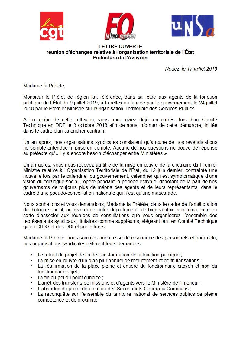 Vous trouverez ICI la lettre ouverte que l’intersyndicale CGT / FO / UNSA de la DDT 12, a remis à Madame la Préfète de l’Aveyron ce matin, lors de la réunion qu’elle organisait entre les Directions des DDI, la DIRECCTE et la préfecture et à laquelle elle a invité les représentants des personnels élus.