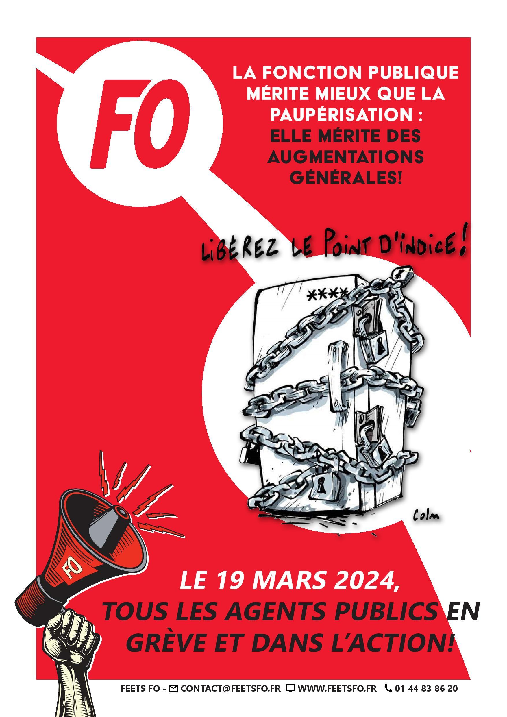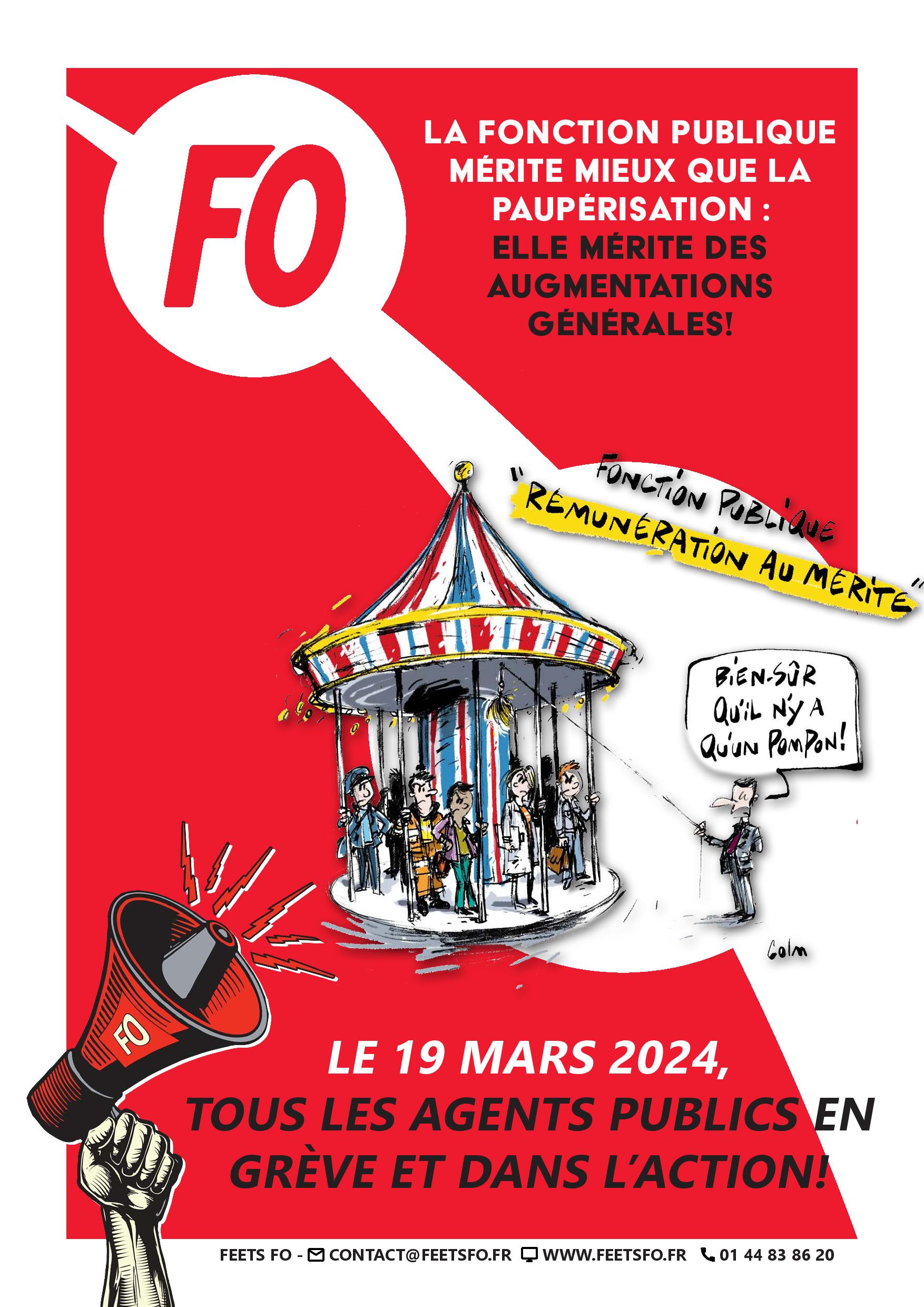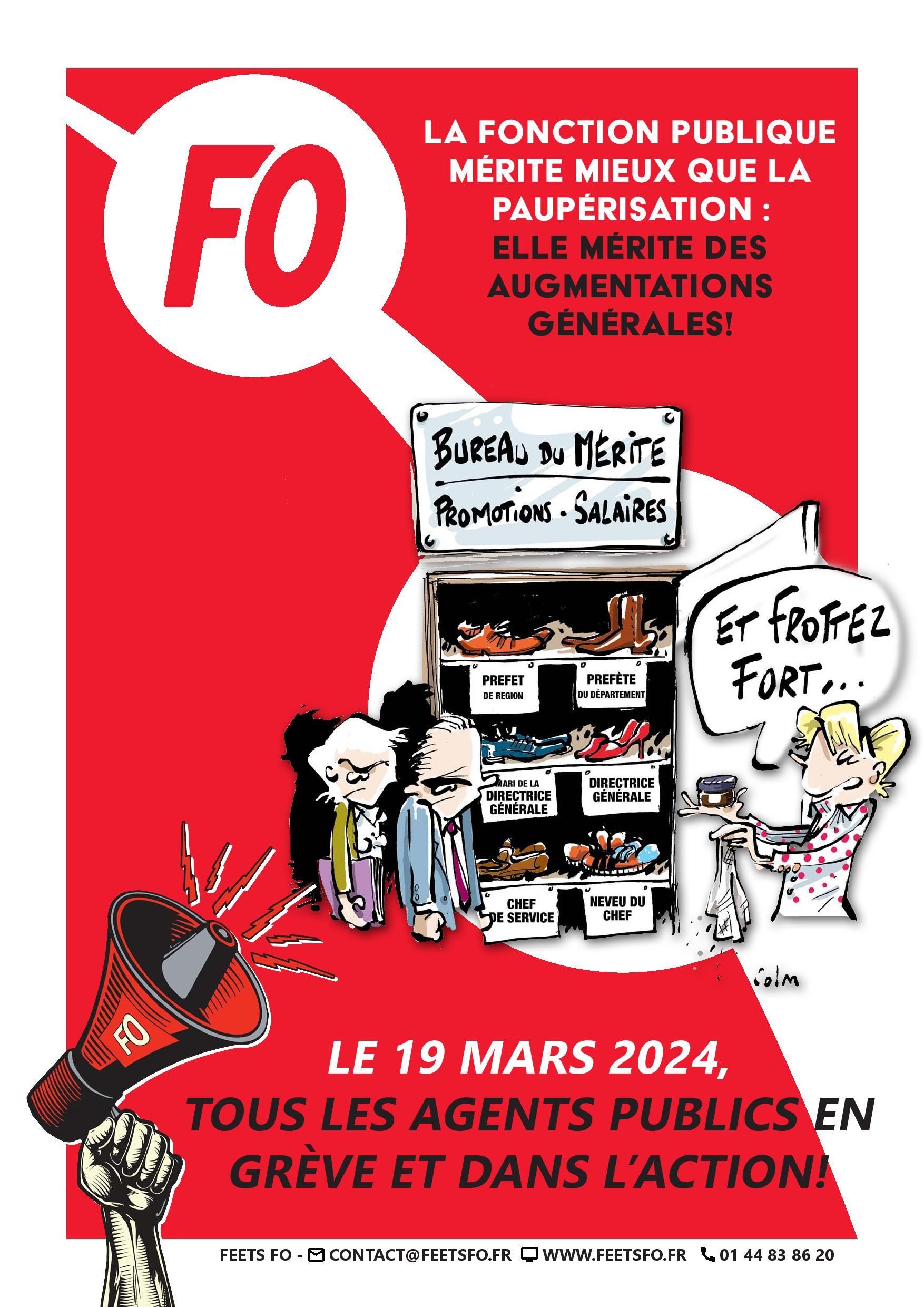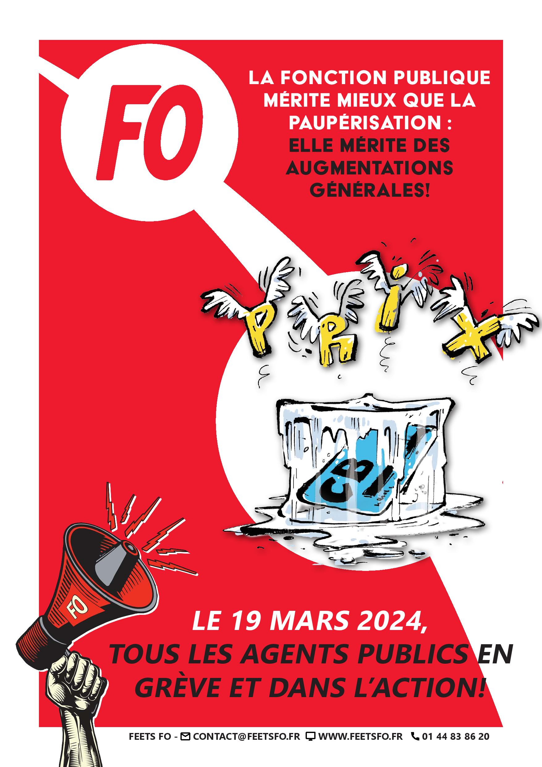 La Fonction Publique mérite des augmentations générales: la preuve en affiches! Affiche 11 mars 2024 Malvina Caubère Une mobilisation couverte par un préavis de grève déposé par FO-Fonction Publique. Cliquez ICI Cliquez ICI Cliquez ICI Cliquez ICI Document lié Affiche_FP_19-mars-2024 PDF — 2 Mo