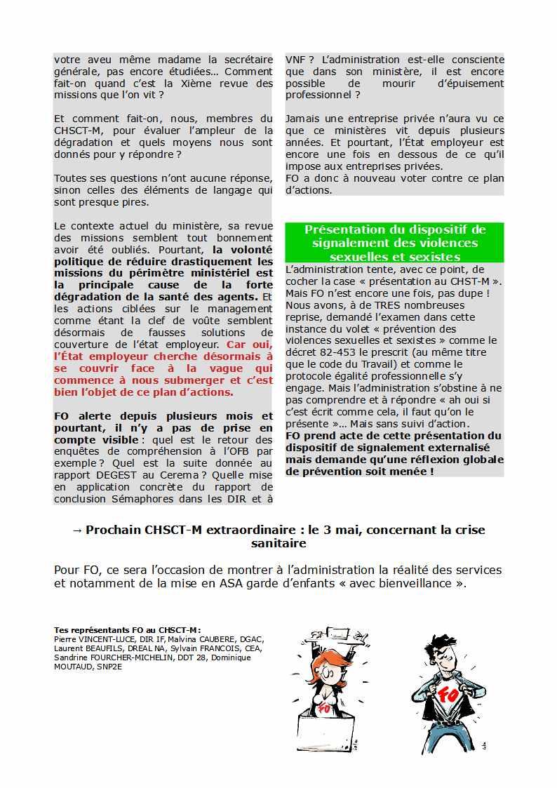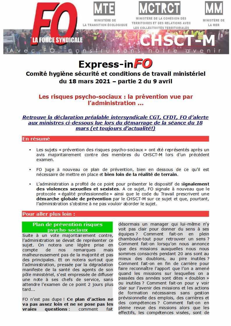 Retrouvez ci-dessous notre Express-inFO issu des débats du CHSCTM du 9 avril 2021, ainsi que la la note signée sans même attendre l’issue des débats du CHSCTM par la Secrétaire générale (consultable ICI), relative au renforcement des mesures de prévention des risques psychosociaux.