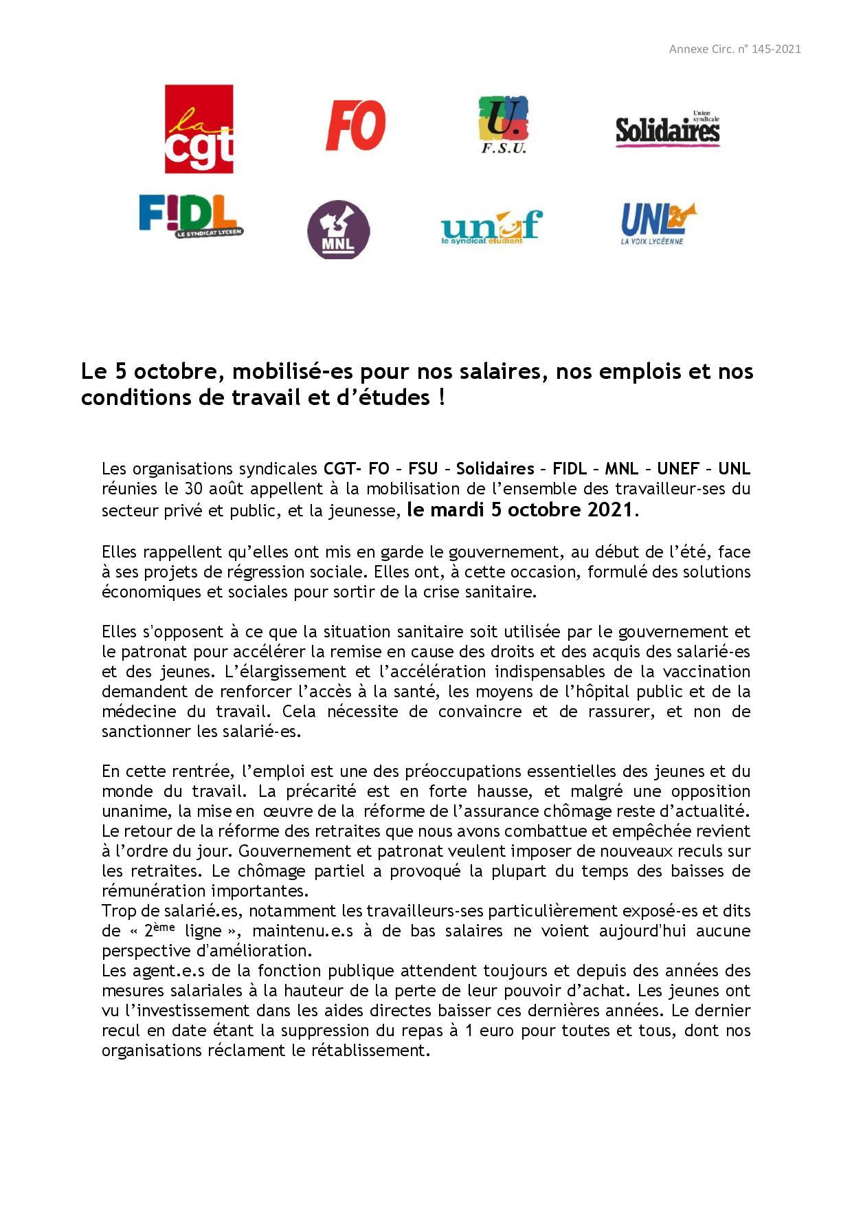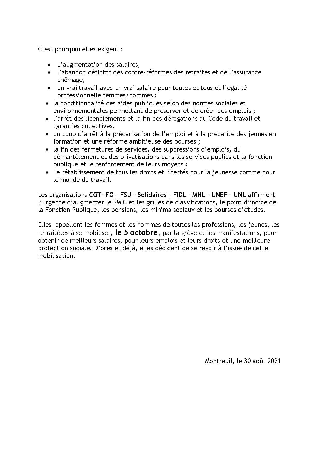 Le 5 octobre, mobilisé es pour nos salaires, nos emplois et nos conditions de travail et d’études Communiqué 31 août 2021 Malvina Caubère