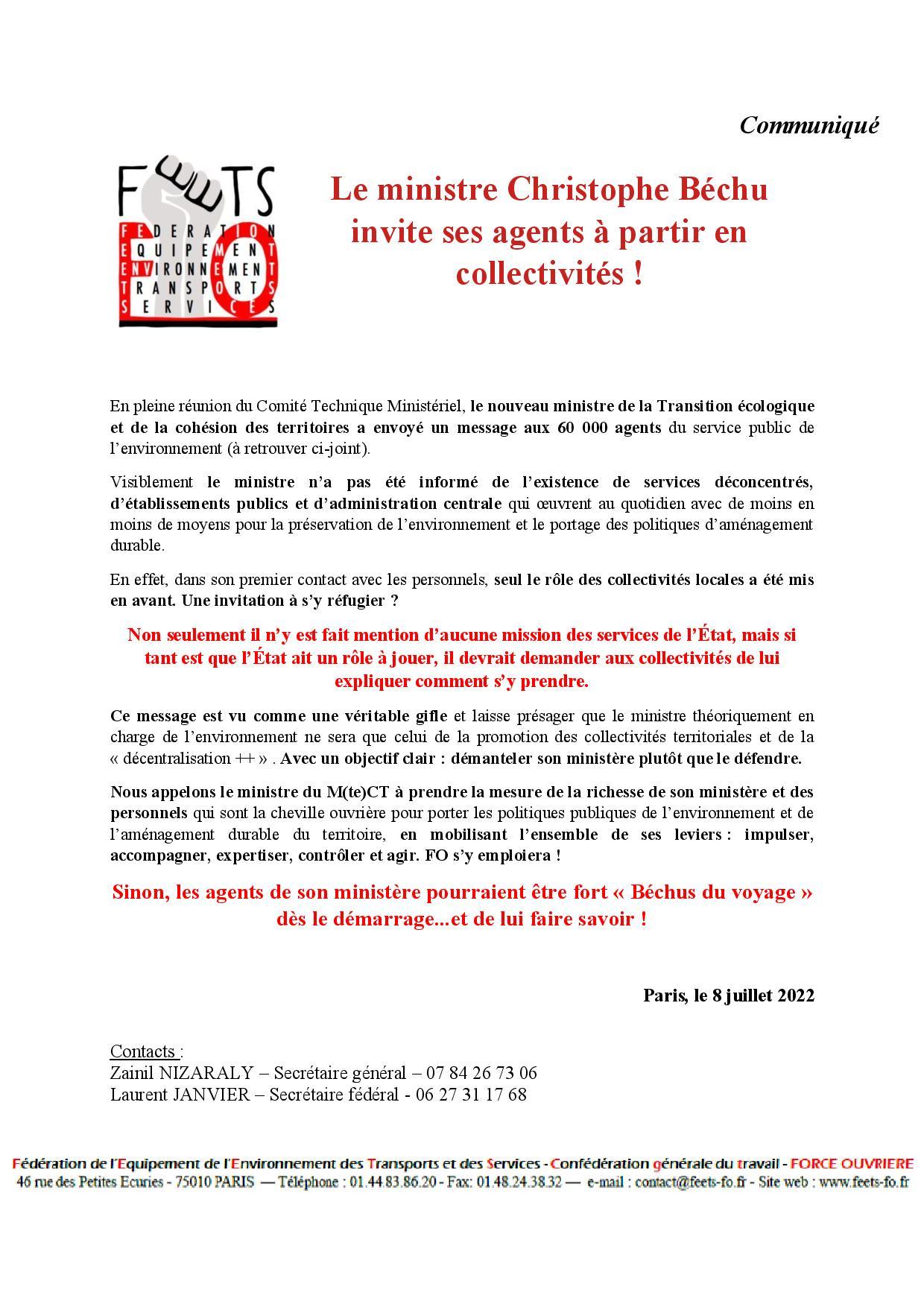 Le ministre Christophe Béchu invite ses agents à partir en collectivités ! Communiqué 8 juillet 2022 Malvina Caubère Cliquez ICI Cliquez ICI
