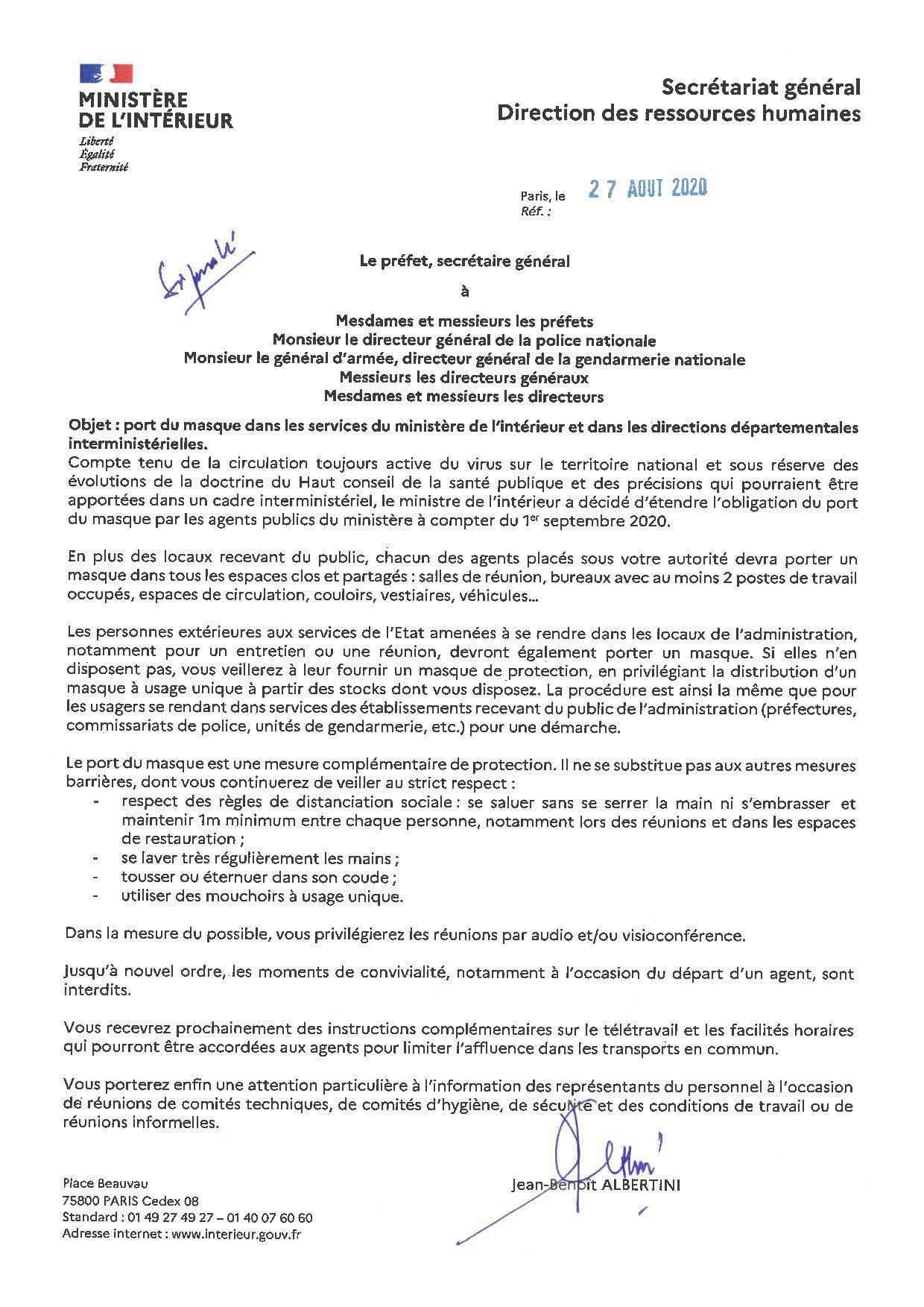 Par une note du 27 août 2020, le SG du Ministère de l’Intérieur précise les instructions relatives au port du masque dans les services du ministère de l’intérieur et dans les directions départementales interministérielles.