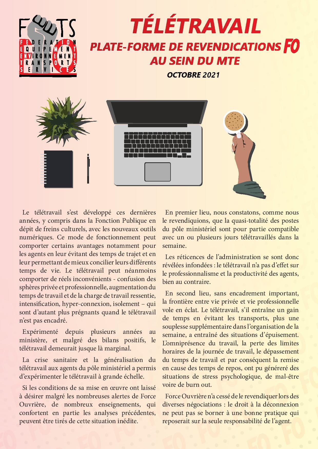 Retrouvez ICI la plateforme de revendications posée par FO sur la table des négociations ouvertes au MTE sur le télétravail en déclinaison de l’accord Fonction Publique du 13 juillet 2021.
