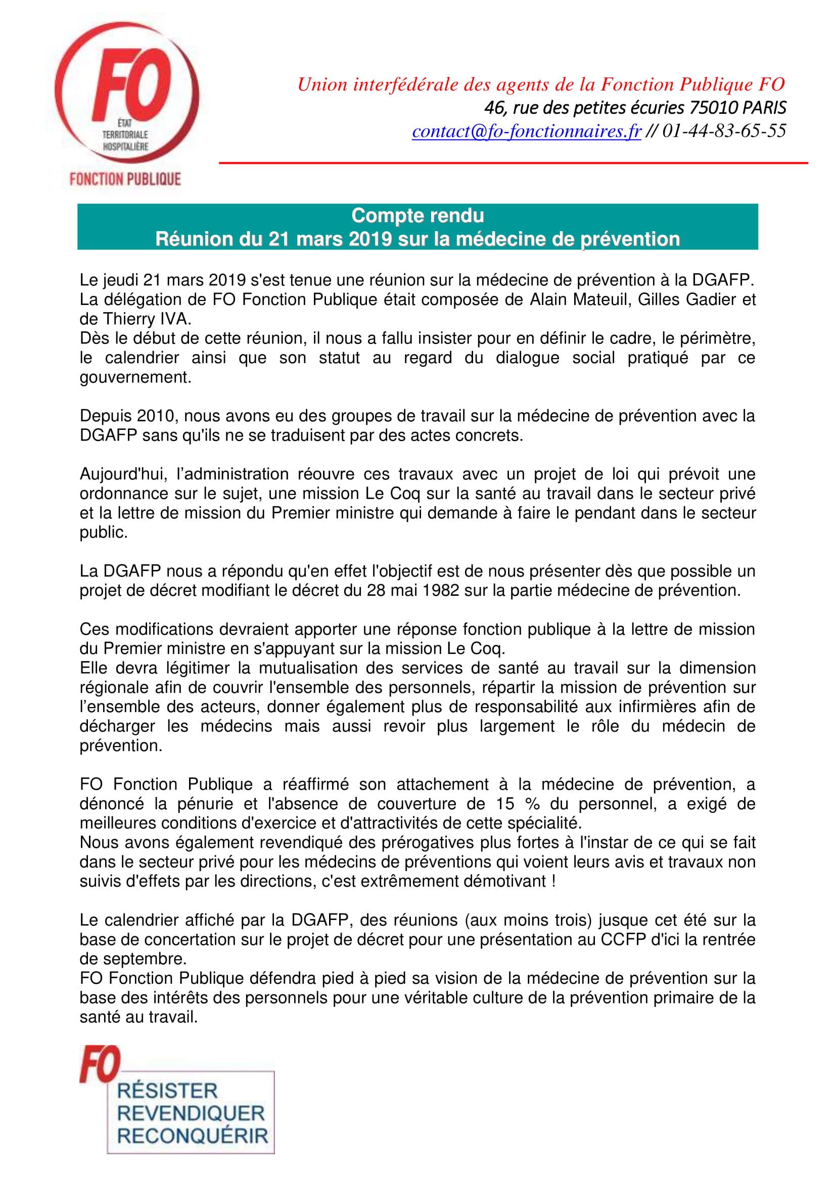 Médecine de prévention: la DGAFP ouvre le chantier CR Réunion 27 mars 2019 Malvina Caubère Retrouvez le compte-rendu de la réunion du 21 mars 2019 ICI. Cliquez ICI