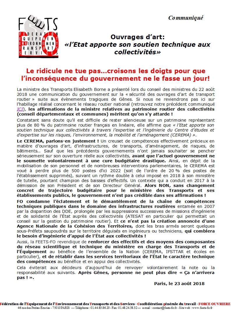 Ouvrages d’art des collectivités: le ridicule ne tue pas…croisons les doigts pour que l’inconséquence du gouvernement ne le fasse un jour! Communiqué 23 août 2018 Malvina Caubère Retrouver ICI le communiqué du 23 août 2018 Document lié LJ_18031_Communique-Ponts-des-collectivites-le-ridicule-ne-tue-pas-1 PDF — 128 Ko