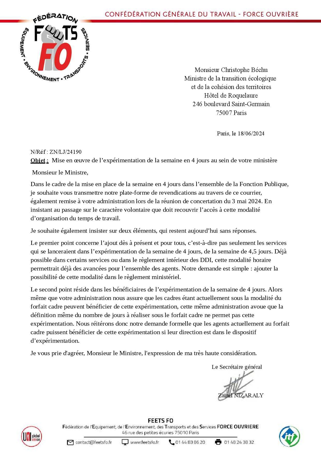 C’est en ce sens que FO a saisi le ministre en transmettant sa plateforme de revendications sur la semaine « en 4 jours ».