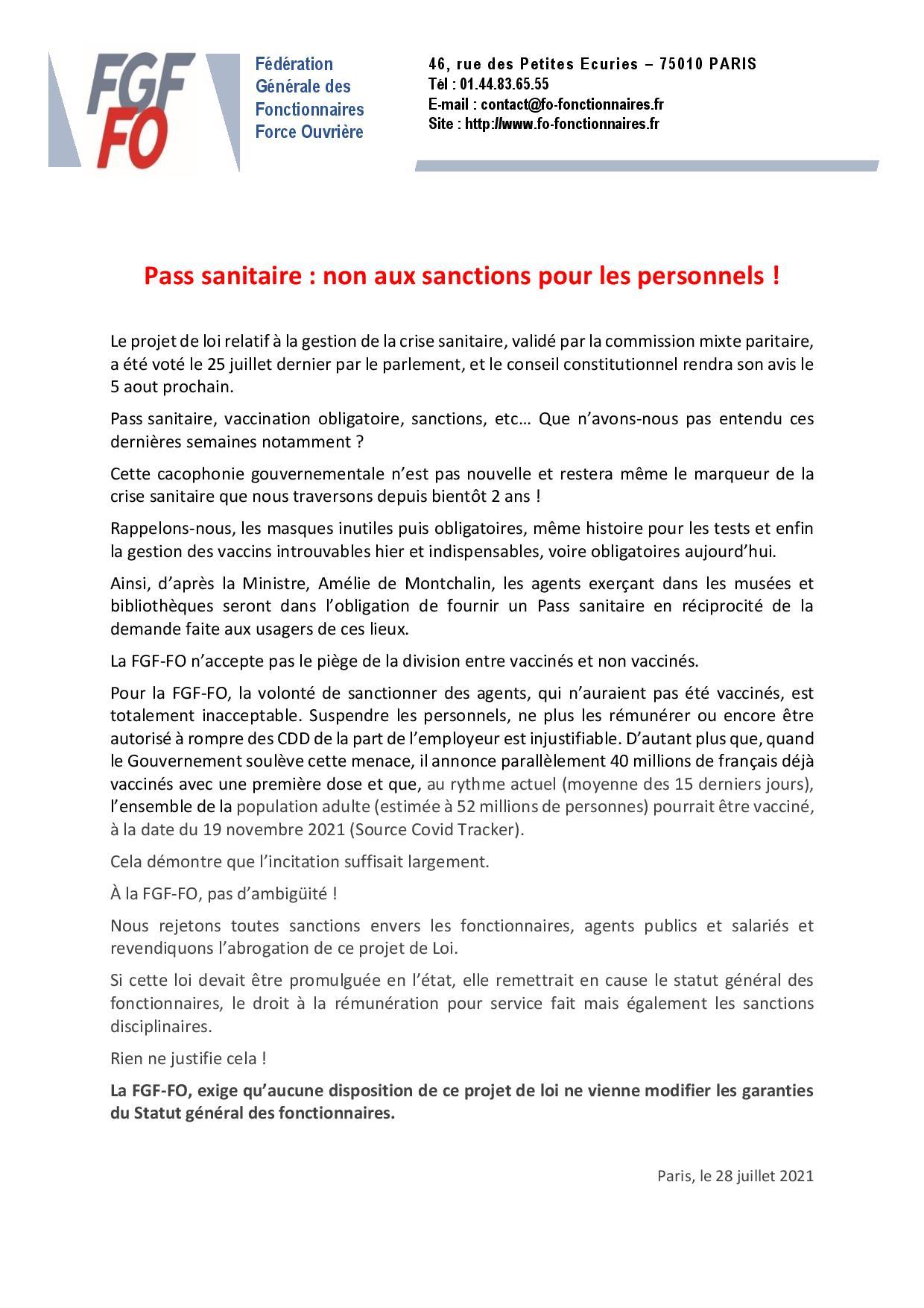 Pass sanitaire : non aux sanctions pour les personnels !