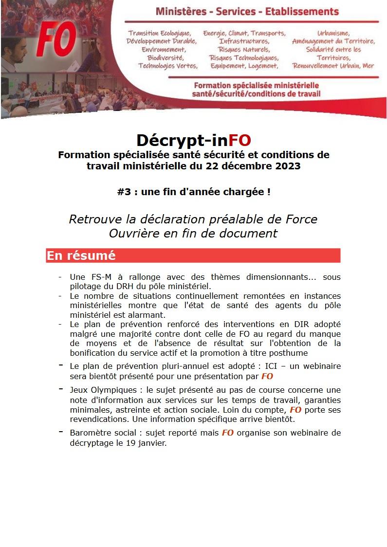 Retrouvez ICI le compte rendu des débats de la formation spécialisée santé/sécurité/conditions de travail du 22 décembre 2023. Une séance dont les débats seront prolongés le 24 janvier 2024 pour traiter sérieusement les enseignements issus du baromètre social (pour les évoquer en primeur, n’hésitez pas à vous inscrire à notre webinaire du 19 janvier – inscriptions ICI).