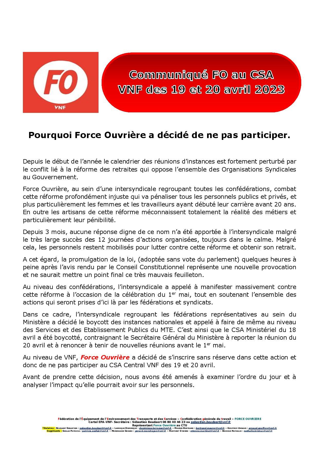 Pourquoi FO a décidé de ne pas participer au CSA des 19 et 20 avril Communiqué 19 avril 2023 Malvina Caubère