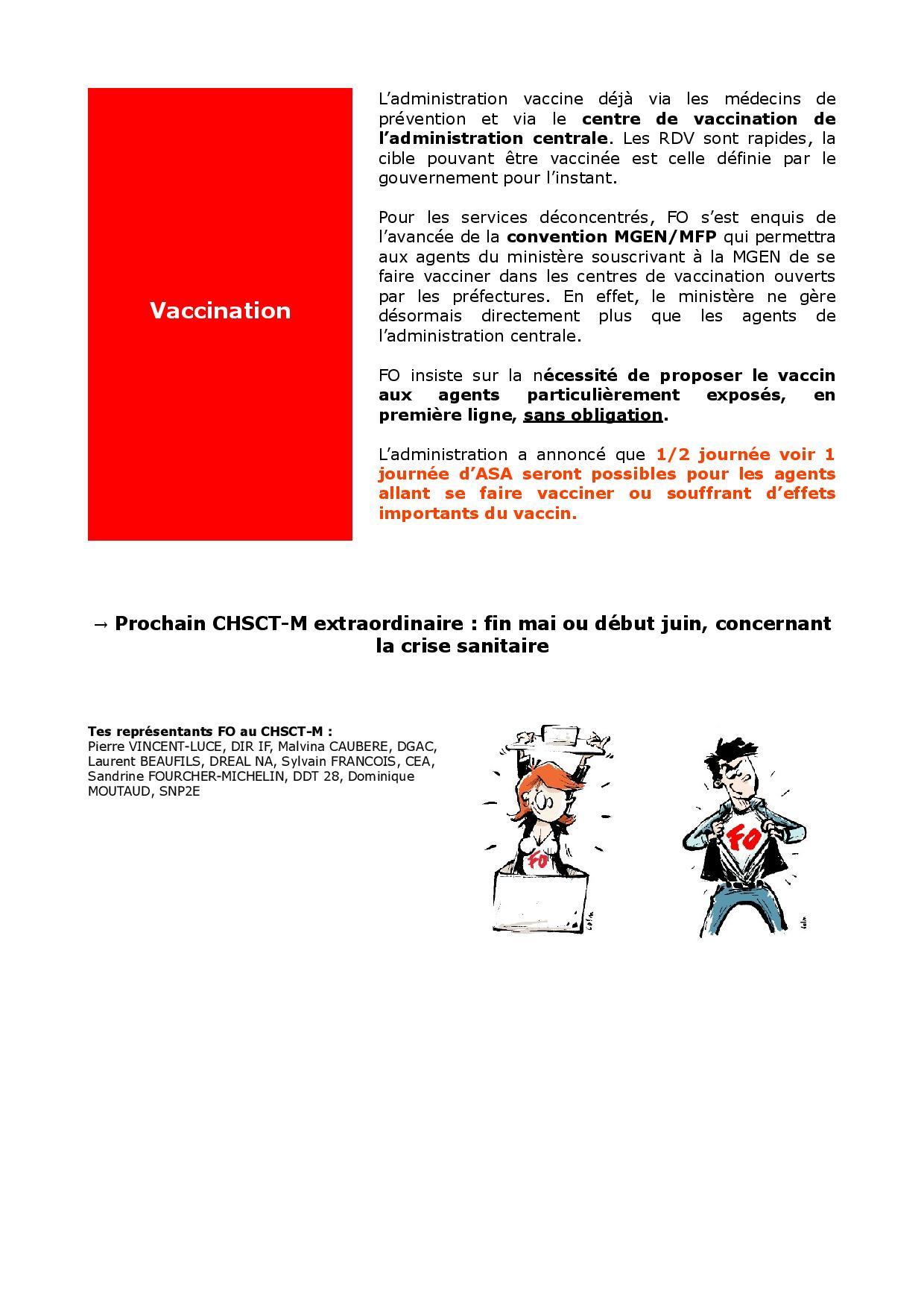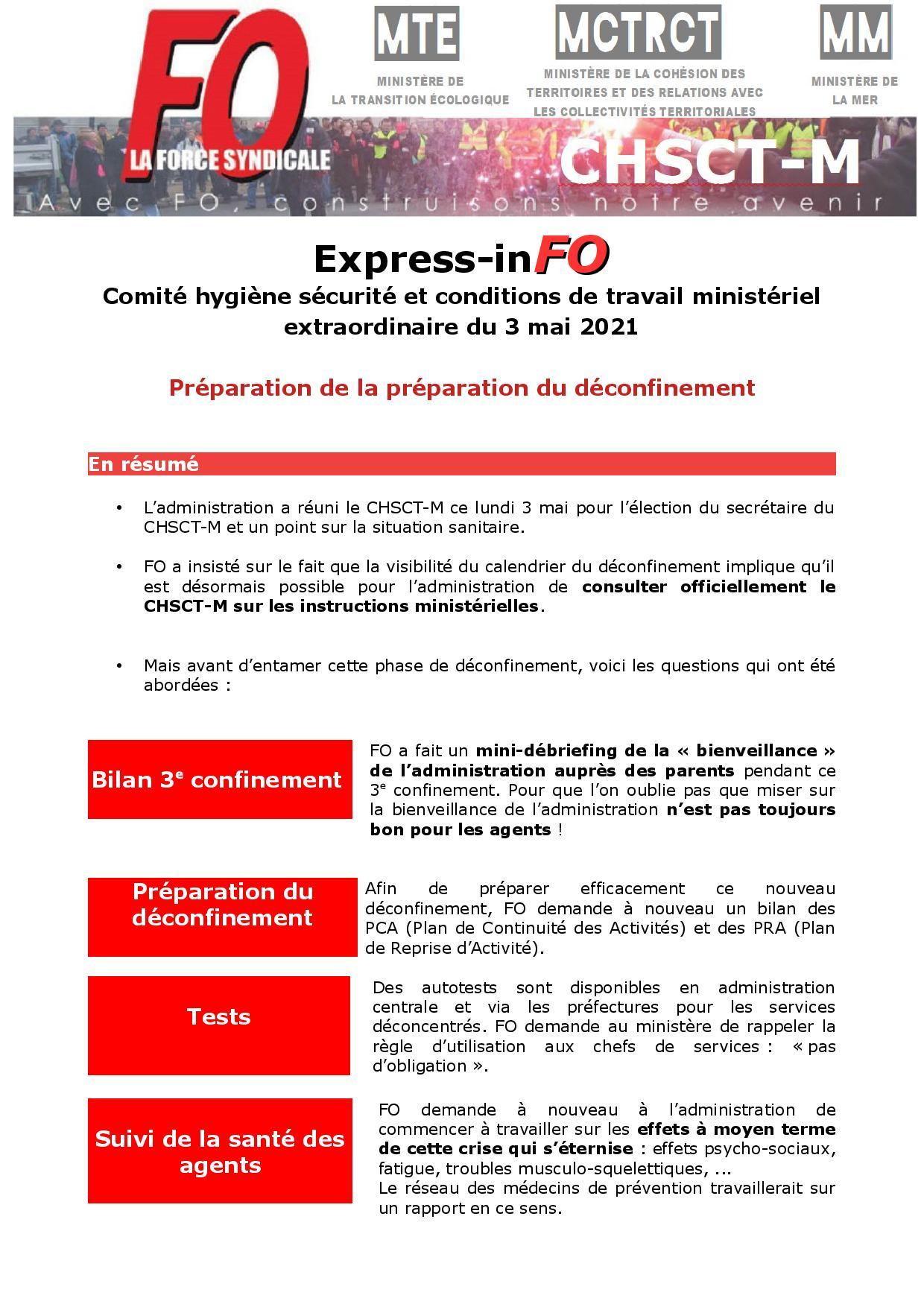 Préparation de la préparation du déconfinement: au menu du CHSCT-M du 3 mai 2021 CR Réunion 7 mai 2021 Malvina Caubère Retrouvez ci-après l’Express-inFO issu des débats du CHSCT-Ministériel du 3 mai 2021. Cliquez ICI Cliquez ICI