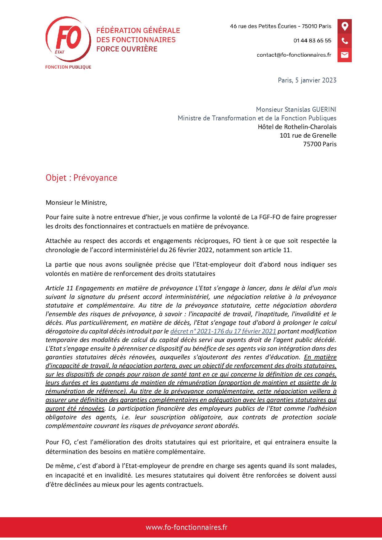 Prévoyance pour les agents publics: FO replace les vraies enjeux de la négociation auprès du ministre Communiqué 9 janvier 2023 Malvina Caubère