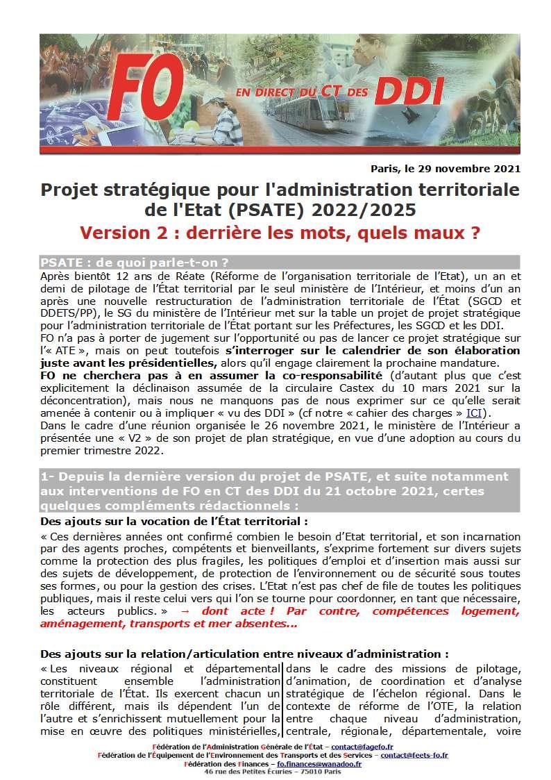 Dans le cadre d’une réunion organisée le 26 novembre 2021, le ministère de l’Intérieur a présentée une « V2 » de son projet de plan stratégique, en vue d’une adoption au cours du premier trimestre 2022. Si FO ne cherchera pas à en assumer la co-responsabilité (d’autant plus que c’est explicitement la déclinaison assumée de la circulaire Castex du 10 mars 2021 sur la déconcentration), nous ne manquons pas de nous exprimer sur ce qu’elle serait amenée à contenir ou à impliquer « vu des DDI ».