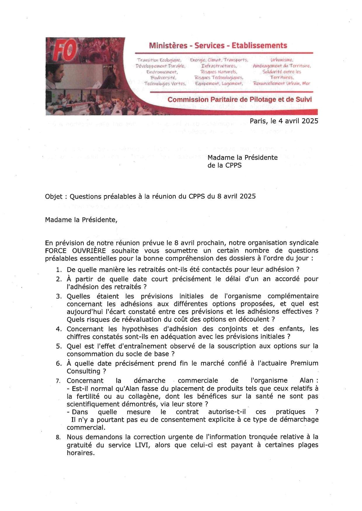 En préparation de la réunion du 8 avril de la Commission Paritaire de Pilotage et de Suivi (CPPS) du dispositif de la Protection Sociale Complémentaire (PSC) du 8 avril 2025, FO a saisi sa présidente afin d’obtenir les réponses concrètes aux interrogations et signalements formulés par nos repésentants dans les services et établissements du MAT/MTE.