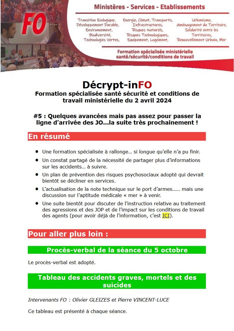 Retrouvez ci-après notre décrypt-inFO issu des débats de la Formation Spécialisée Santé Sécurité et Conditions de Travail ministérielle du 2 avril 2024.