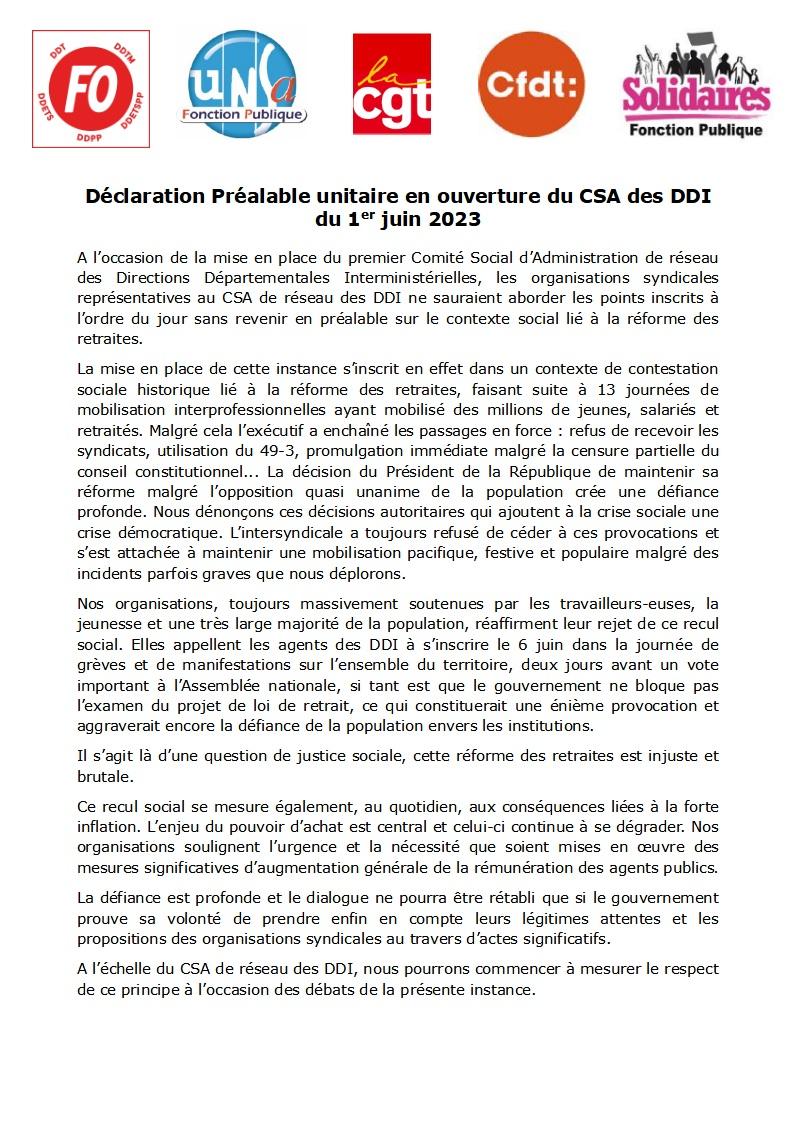 Retraites: la déclaration unitaire en ouverture du CSA des DDI Communiqué 1 juin 2023 Malvina Caubère Cliquez ICI Document lié DP-unitaire-CSA-des-DDI-VF-1 PDF — 94 Ko