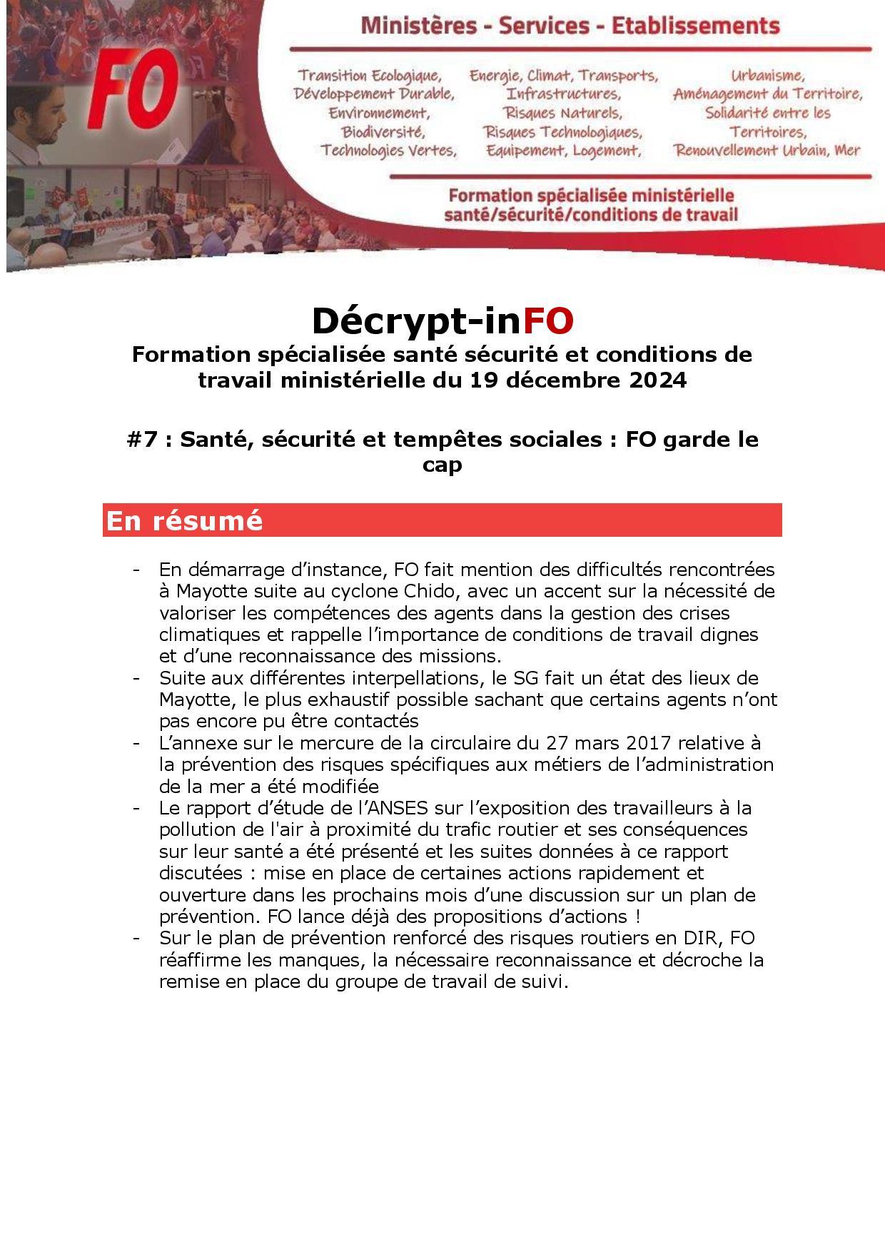Retrouvez ci-après le décrypt-inFO issu des débats de la Formation Spécialisée Santé Sécurité et Conditions de Travail Ministérielle du 19 décembre 2024.