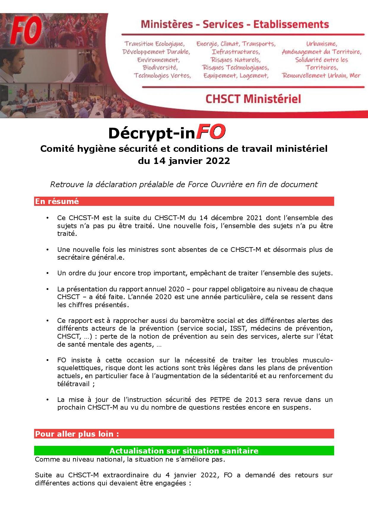Situation sanitaire, rapport annuel 2020 sur la santé, la sécurité et les conditions d e travail: au menu du CHSCTM du 14 janvier 2022 CR Réunion 20 janvier 2022 Malvina Caubère Retrouvez ICI le décrypt-inFO issu des débats du CHSCT ministériel du 14 janvier 2022. Cliquez ICI