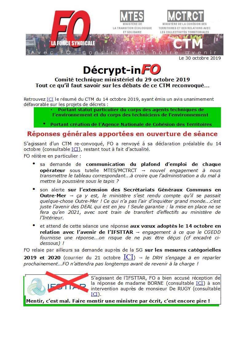 Retrouvez ICI le décrypt-inFO du CTM du 29 octobre 2019, re-convoqué suite au vote unanimement défavorable lors de la séance du 14 octobre sur les projets de décrets: