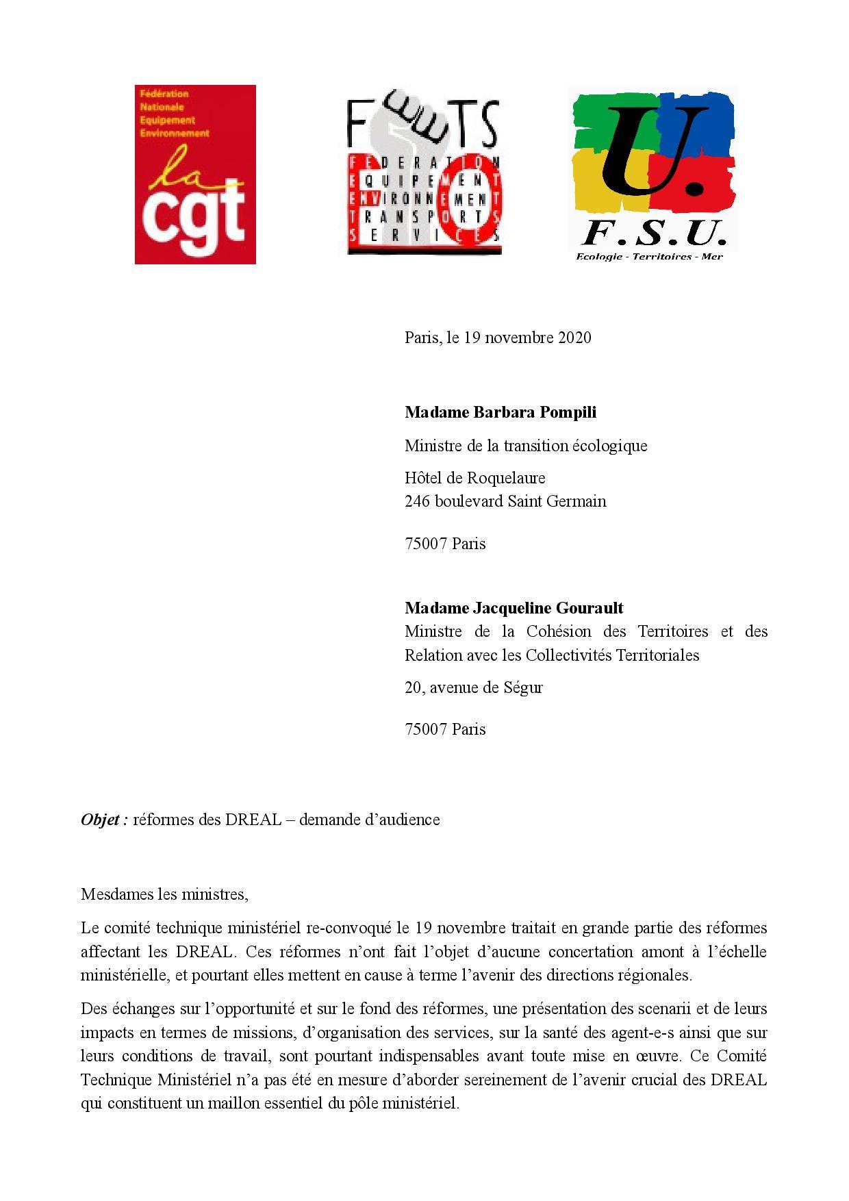 Suite au CTM du 19 novembre, les ministres interpellées sur l’avenir des DREAL Communiqué 20 novembre 2020 Malvina Caubère Caption Cliquez ICI Document lié Demande-daudience-CGT-FO-FSU-DREAL PDF — 174 Ko