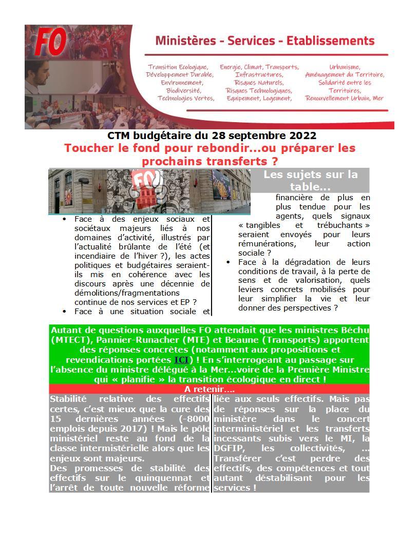 Autant de questions auxquelles FO attendait que les ministres Béchu (MTECT), Pannier-Runacher (MTE) et Baune (Transports) apportent des réponses concrètes lors du CTM budgétaire du 28 septembre (notamment aux propositions et revendications portées ICI) ! En s’interrogeant au passage sur l’absence du ministre délégué à la Mer…voire la Première Ministre qui « planifie » la transition écologique en direct !
