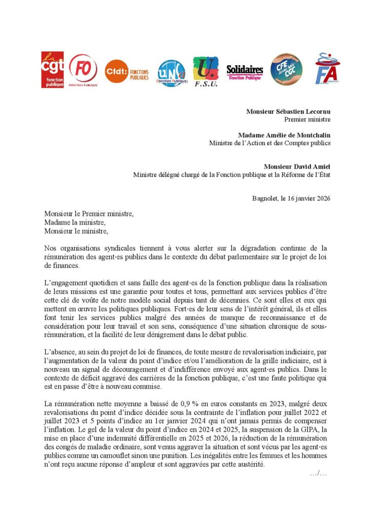 Dans un courrier commun adressé au Premier ministre et aux ministres concernés, les organisations syndicales de la Fonction publique alertent sur la dégradation continue des rémunérations des agents. Gel du point d’indice, suspension de la GIPA, congés maladie pénalisés : l’austérité salariale franchit un nouveau seuil, au détriment de l’attractivité et de la justice sociale.