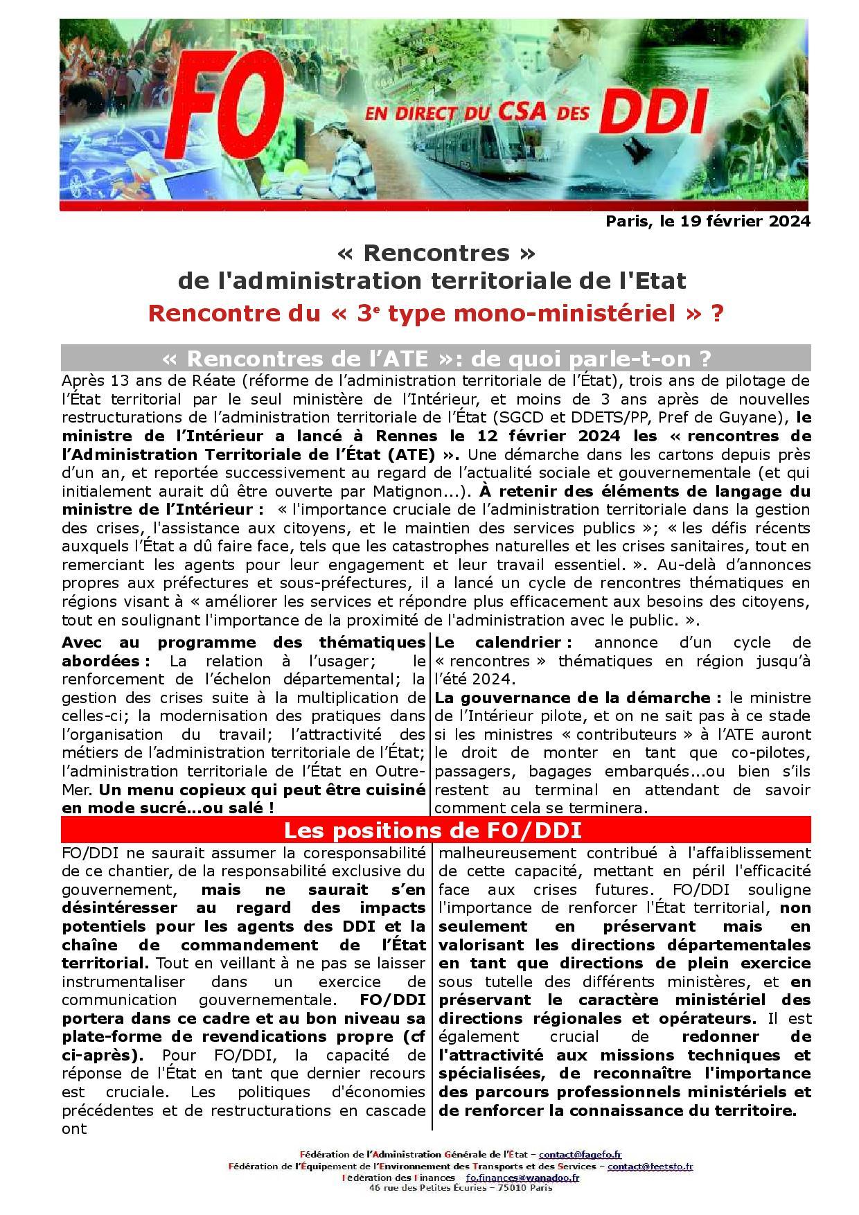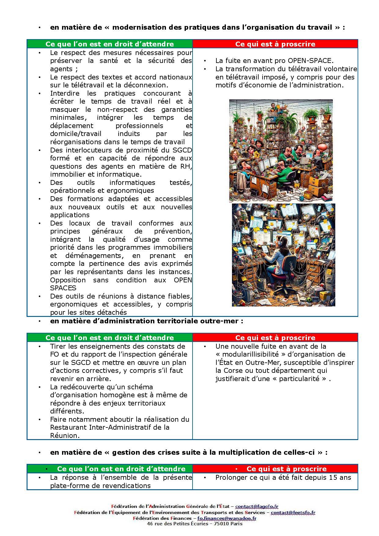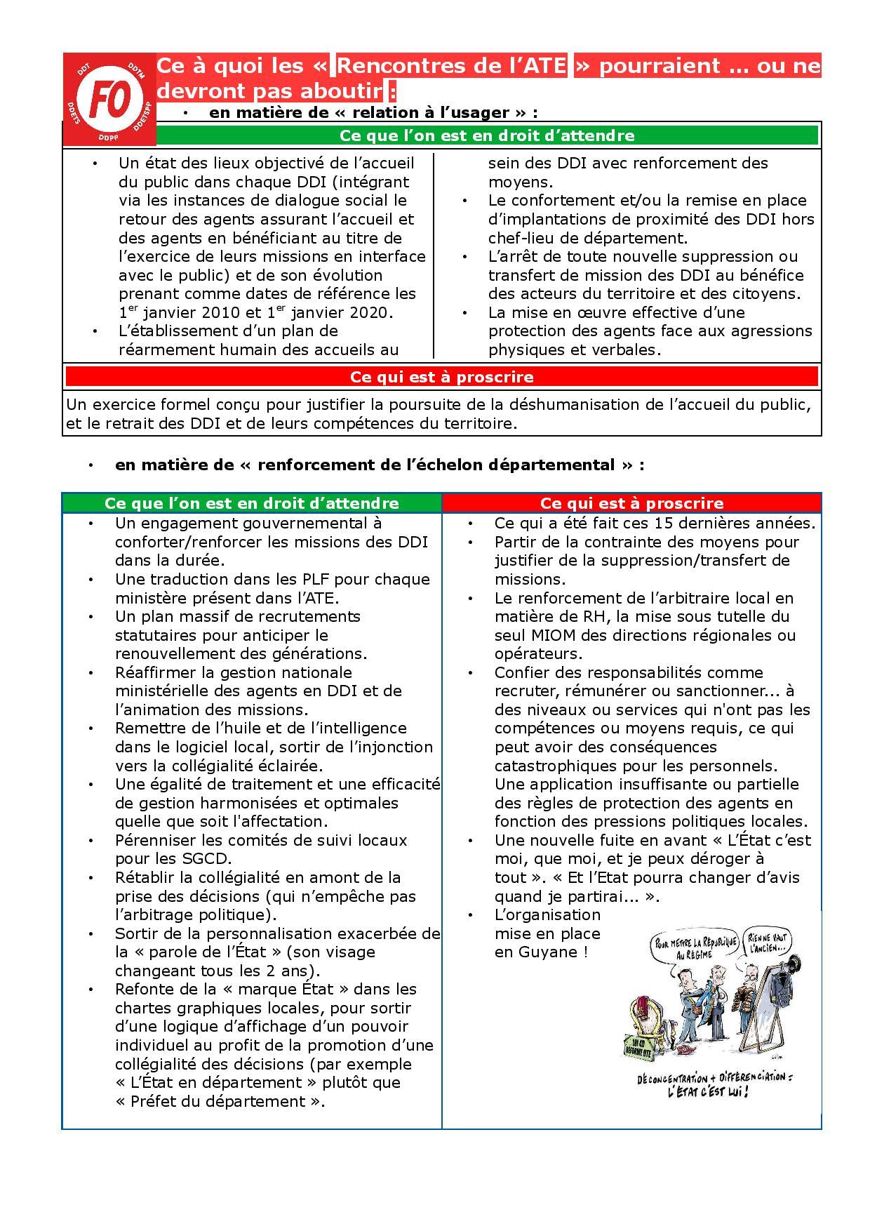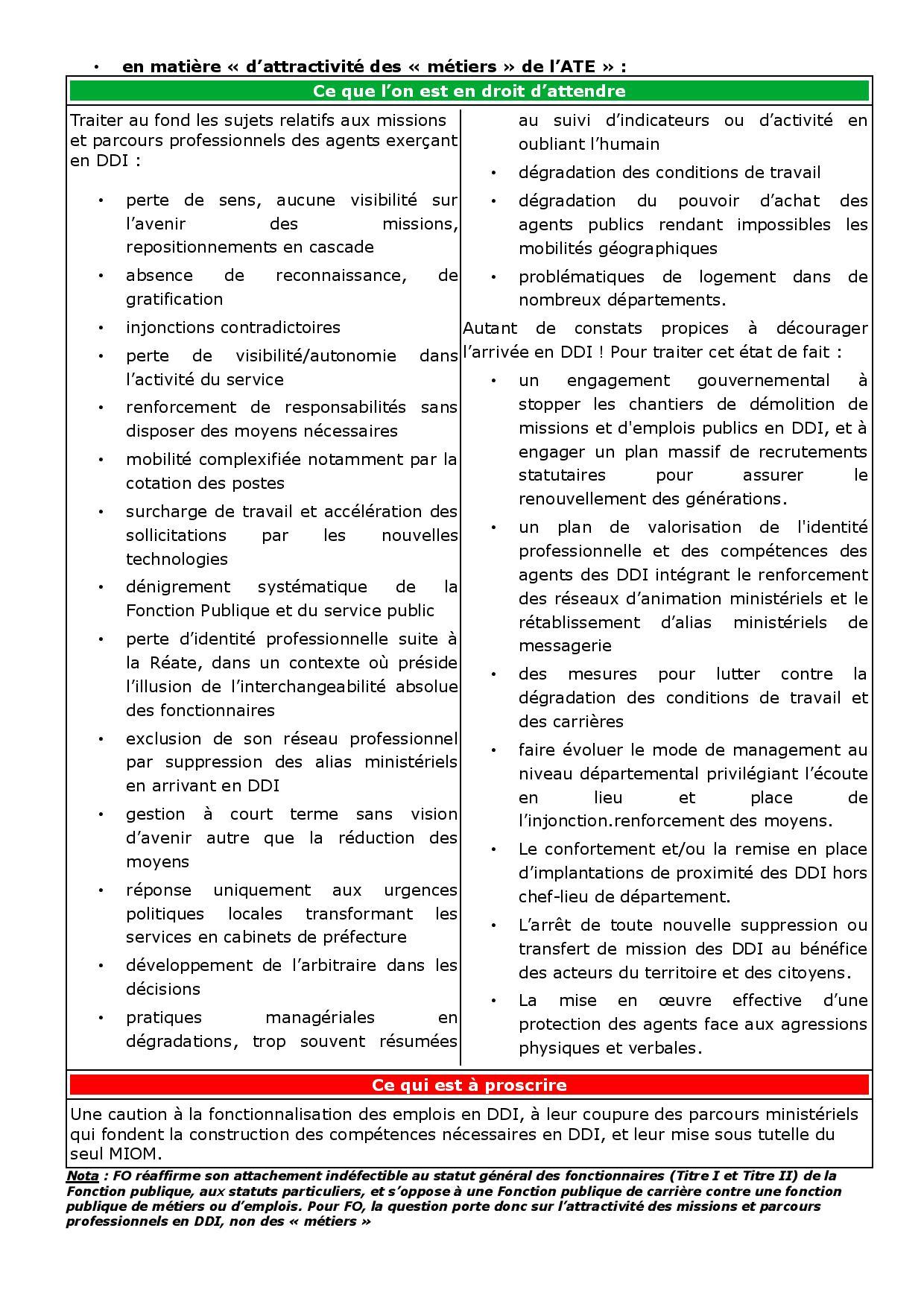 FO/DDI ne saurait assumer la coresponsabilité de ce chantier, de la responsabilité exclusive du gouvernement, mais ne saurait s’en désintéresser au regard des impacts potentiels pour les agents des DDI et la chaîne de commandement de l’État territorial. Dans ce cadre, FO/DDI a formalisé sa plate-forme de revendications propre, à retrouver ci-dessous.
