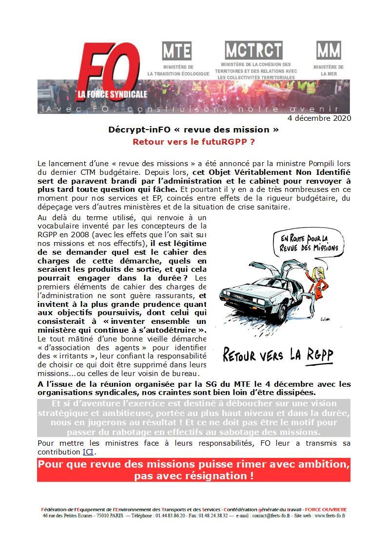 Le lancement d’une « revue des missions » a été annoncé par la ministre Pompili lors du dernier CTM budgétaire. Depuis lors, cet Objet Véritablement Non Identifié sert de paravent brandi par l’administration et le cabinet pour renvoyer à plus tard toute question qui fâche. Et pourtant il y en a de très nombreuses en ce moment pour nos services et EP, coincés entre effets de la rigueur budgétaire, du dépeçage vers d’autres ministères et de la situation de crise sanitaire.