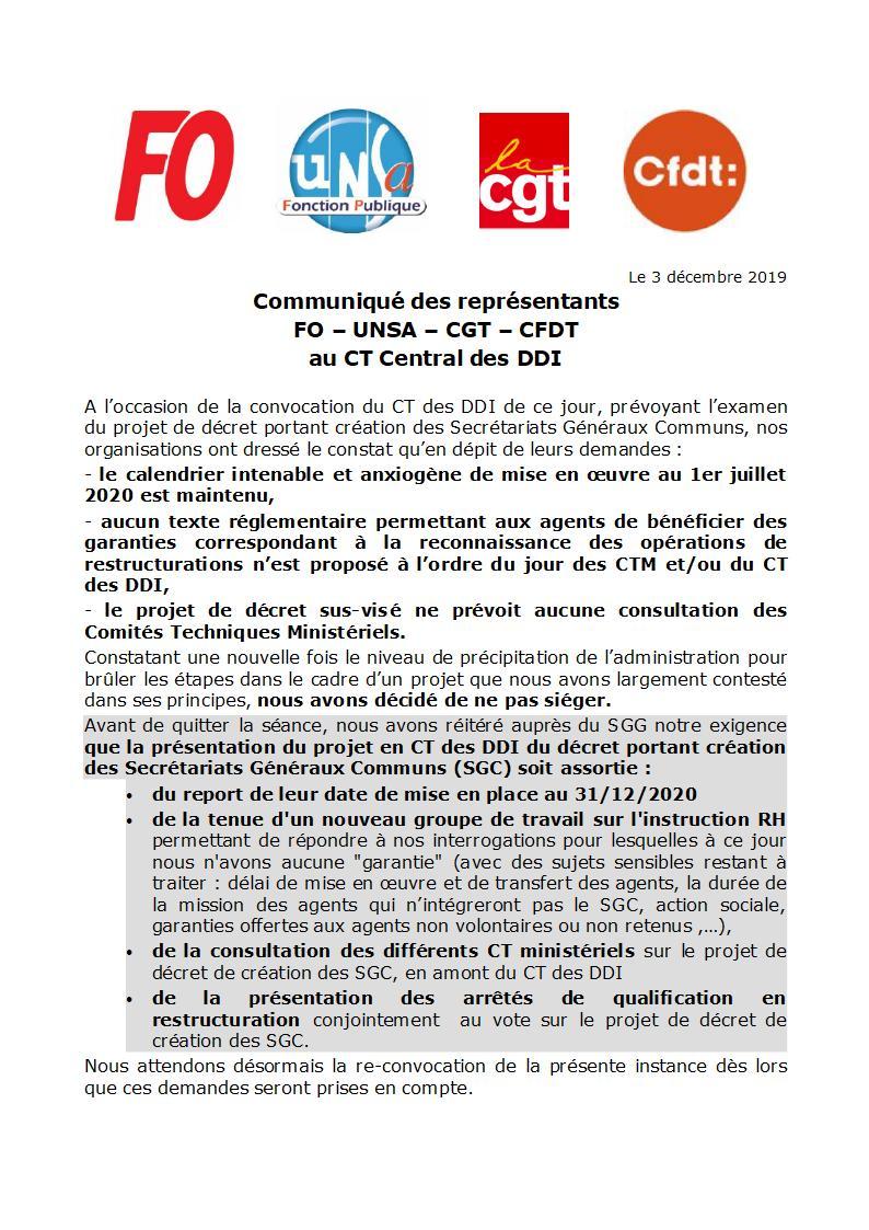 A l’occasion de la convocation du CT des DDI de ce jour, prévoyant l’examen du projet de décret portant création des Secrétariats Généraux Communs,