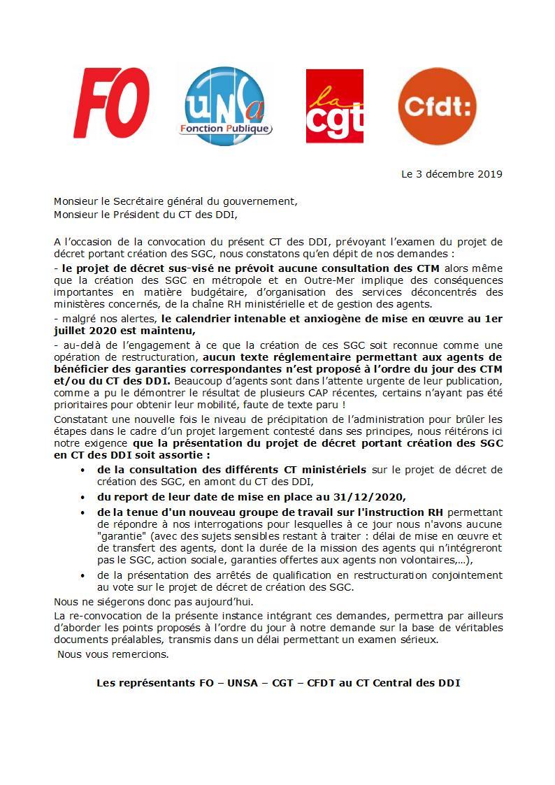 de la consultation des différents CT ministériels sur le projet de décret de création des SGC, en amont du CT des DDI
