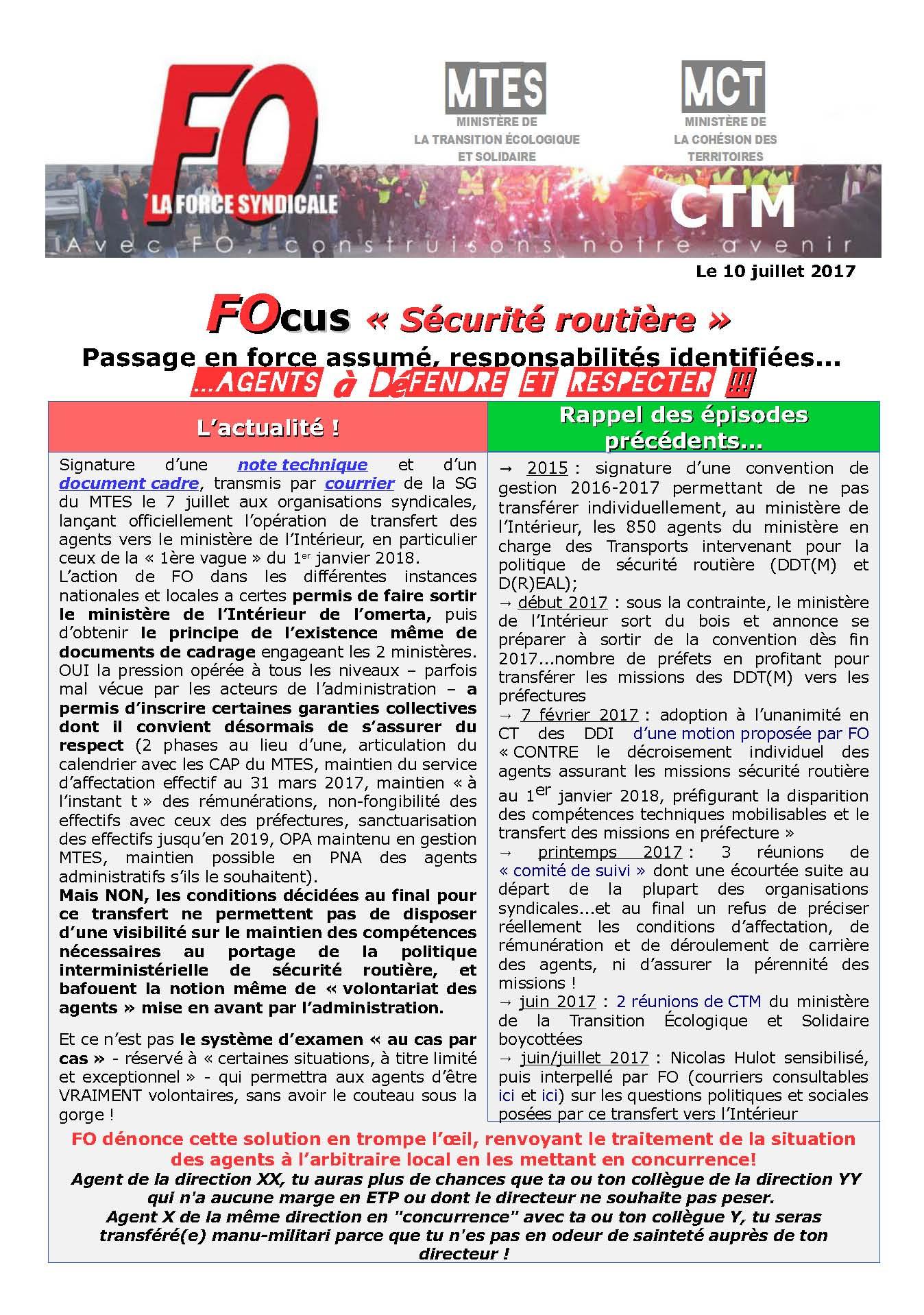 La transmission, vendredi 7 juillet en fin de soirée, des documents de cadrage signés relatifs au transfert des agents en charge de missions « sécurité routière » en DDT(M)/DREAL et DEAL ouvre une nouvelle phase de la bataille conduite depuis fin 2016 pour la défense des missions, des services et des agents.