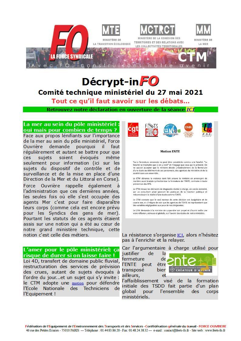 Retrouvez ci-après notre Décrypt-inFO issu des débats du Comité Technique Ministériel du 27 mai, ainsi que les éléments portés par FO en ouverture ICI.