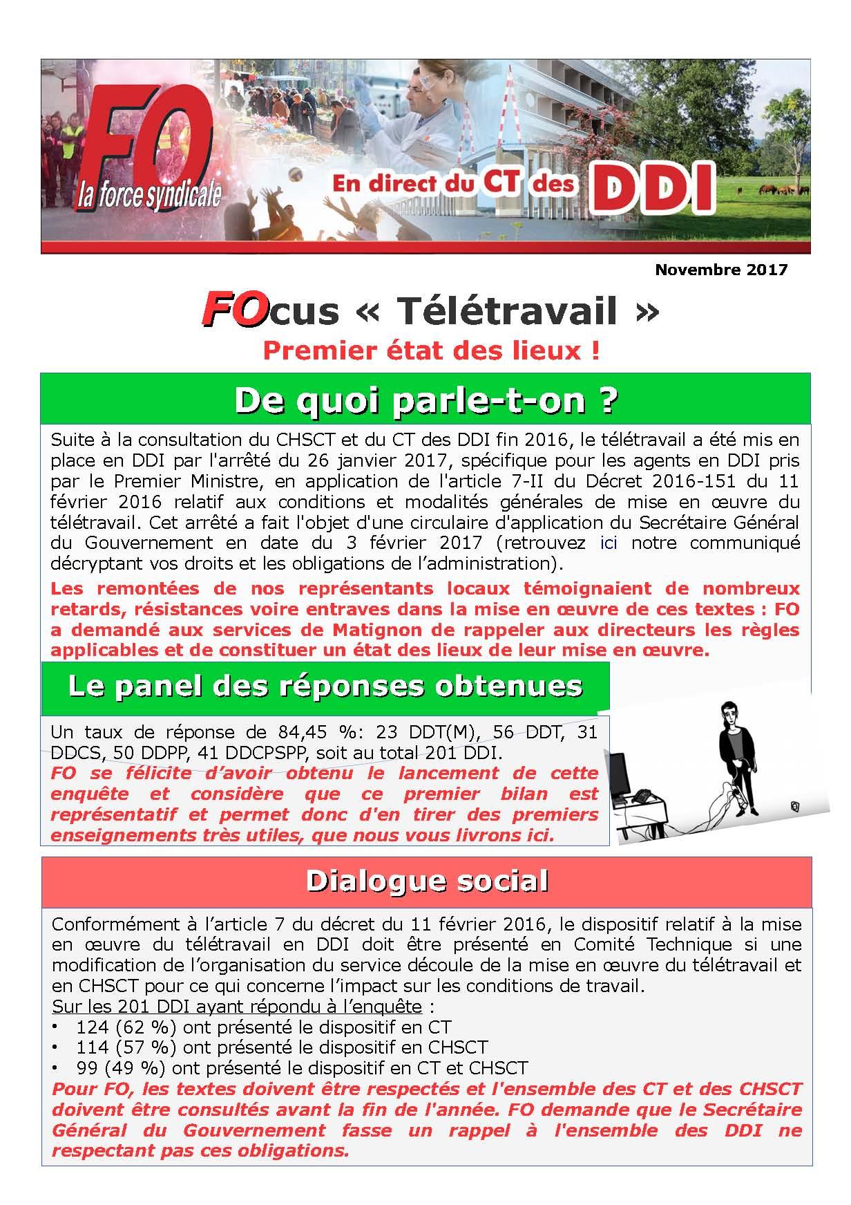 Les remontées de nos représentants locaux témoignaient de nombreux retards, résistances voire entraves dans la mise en œuvre des textes relatifs au télétravail en DDI: FO a demandé aux services de Matignon de rappeler aux directeurs les règles applicables et de constituer un état des lieux de leur mise en œuvre.